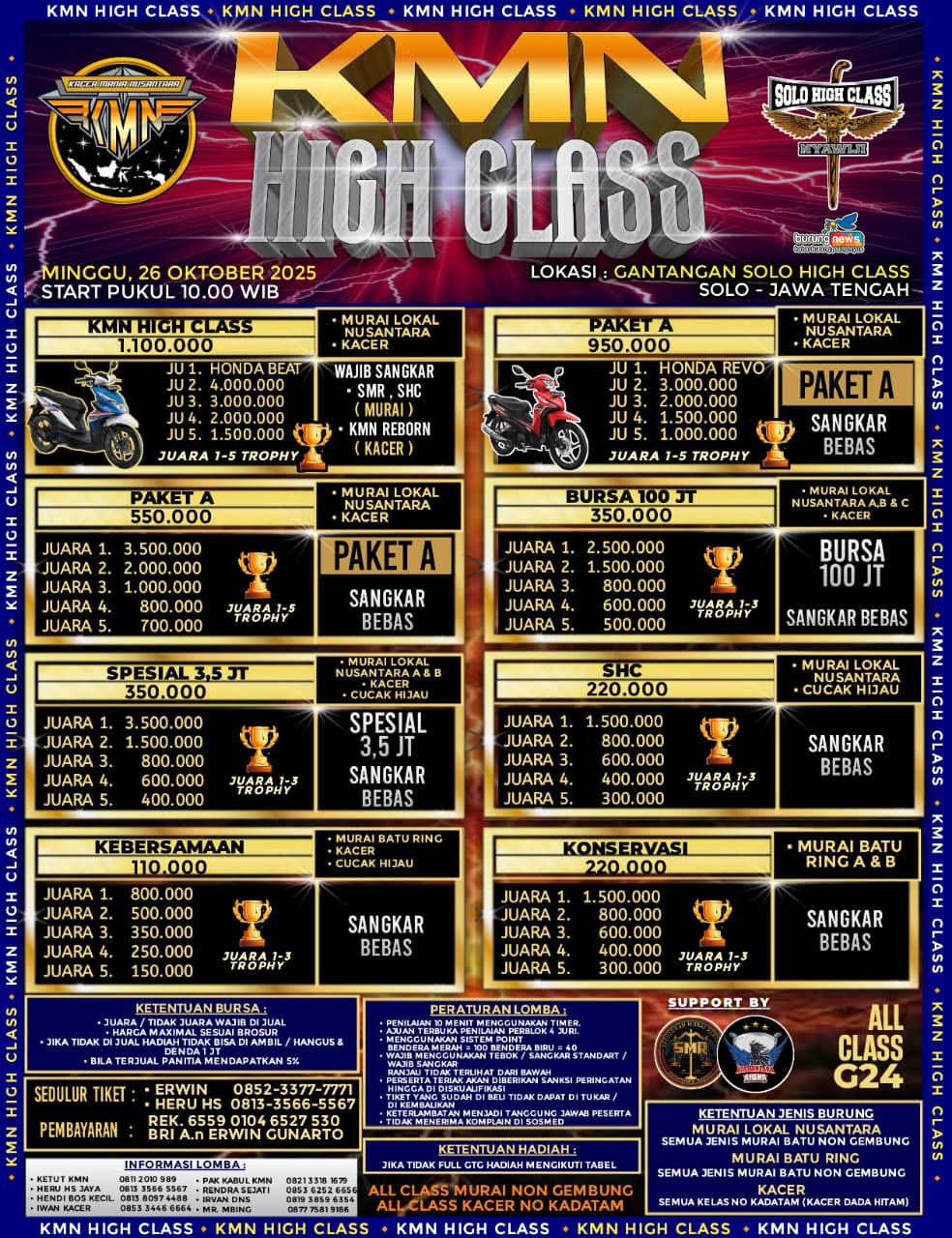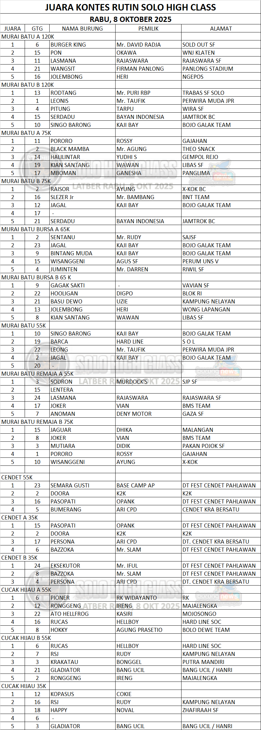 Pada event Latber rutin di Solo High Class, Rabu pekan ke-4, 8 Oktober 2025, terlihat ada beberapa kelas yang tidak penuh. Beberapa sesi ada yang kosong satu, dua, hingga empat titik gantungan tak terisi burung.