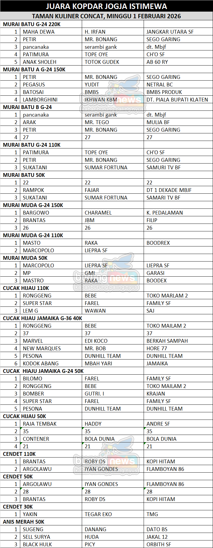 Pancanaka sebelumnya meraih peringkat 3 kelas Murai Batu 24G 250K, kelas utama. “Paska pulang dari Solo waktu itu langsung 4 sayapnya lepas, istirahat total. Ini pertama turun,” terang Arung Darmawan, sang pemilik.