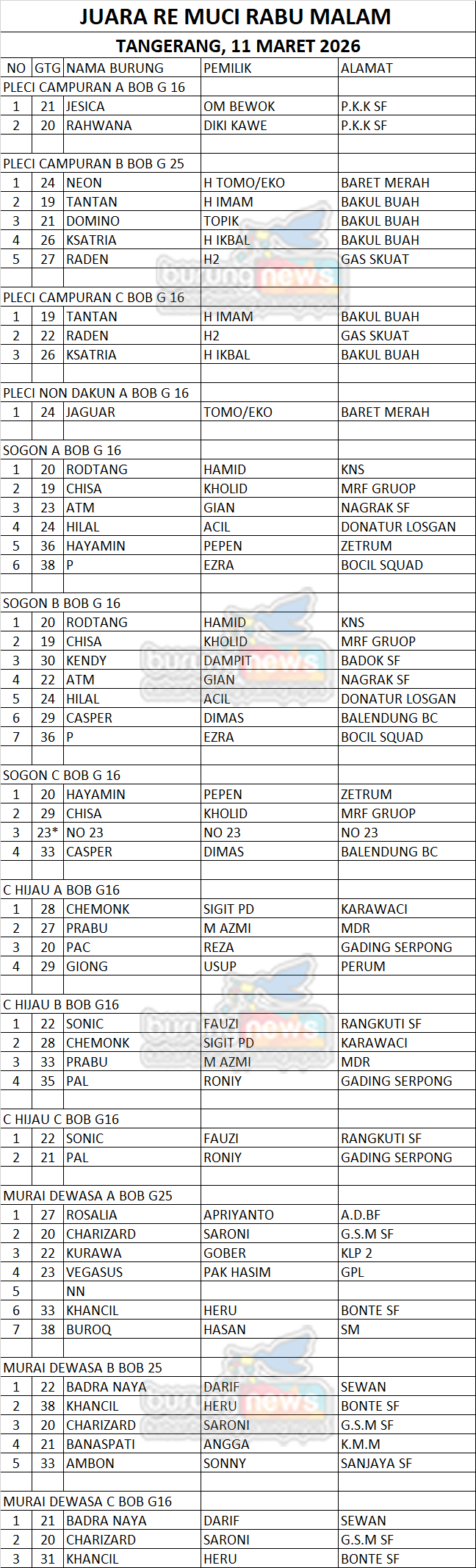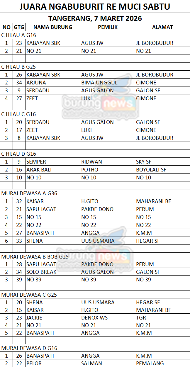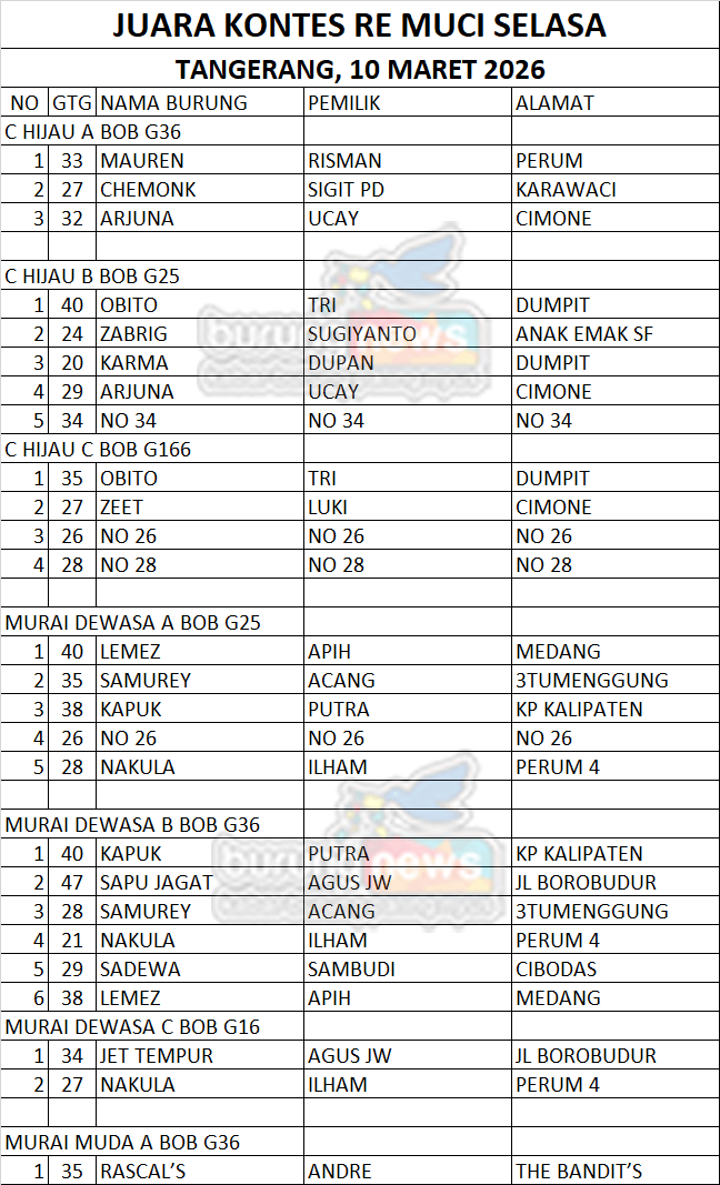 Gantangan burung berkicau Re Muci, yang terletak di Pasar Modern Mutiara Karawaci Tangerang kembali menggelar Liga seri ke-7 untuk klas komunitas dan kelas umum. Dimulai hari Sabtu 7 Maret 2026, hingga puncak final penghitungan poinnya Jumat 1 Mei 2026.