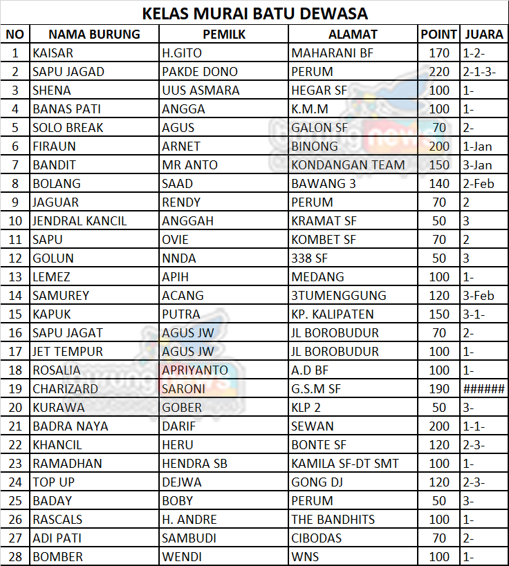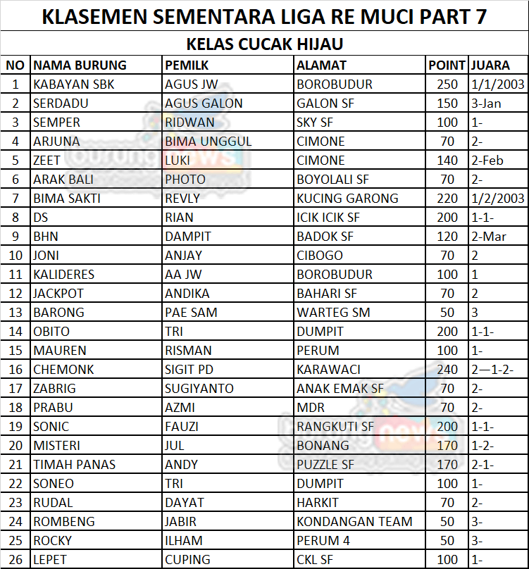 Meski di awal Liga terjadi hujan dan kembali banjir di beberapa jalur yang dilewati kicau mania, panitia tetap membuka kegiatan rutin menggantang. Berikut data juara, galeri foto, hingga data klasemen liga dan jadwal even berikutnya.