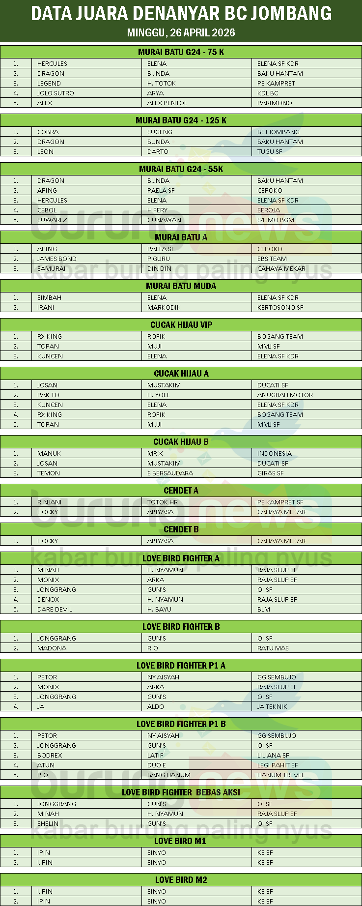 KATA KUNCI: love bird bersatu denanyar bc data juara jonggrang petor