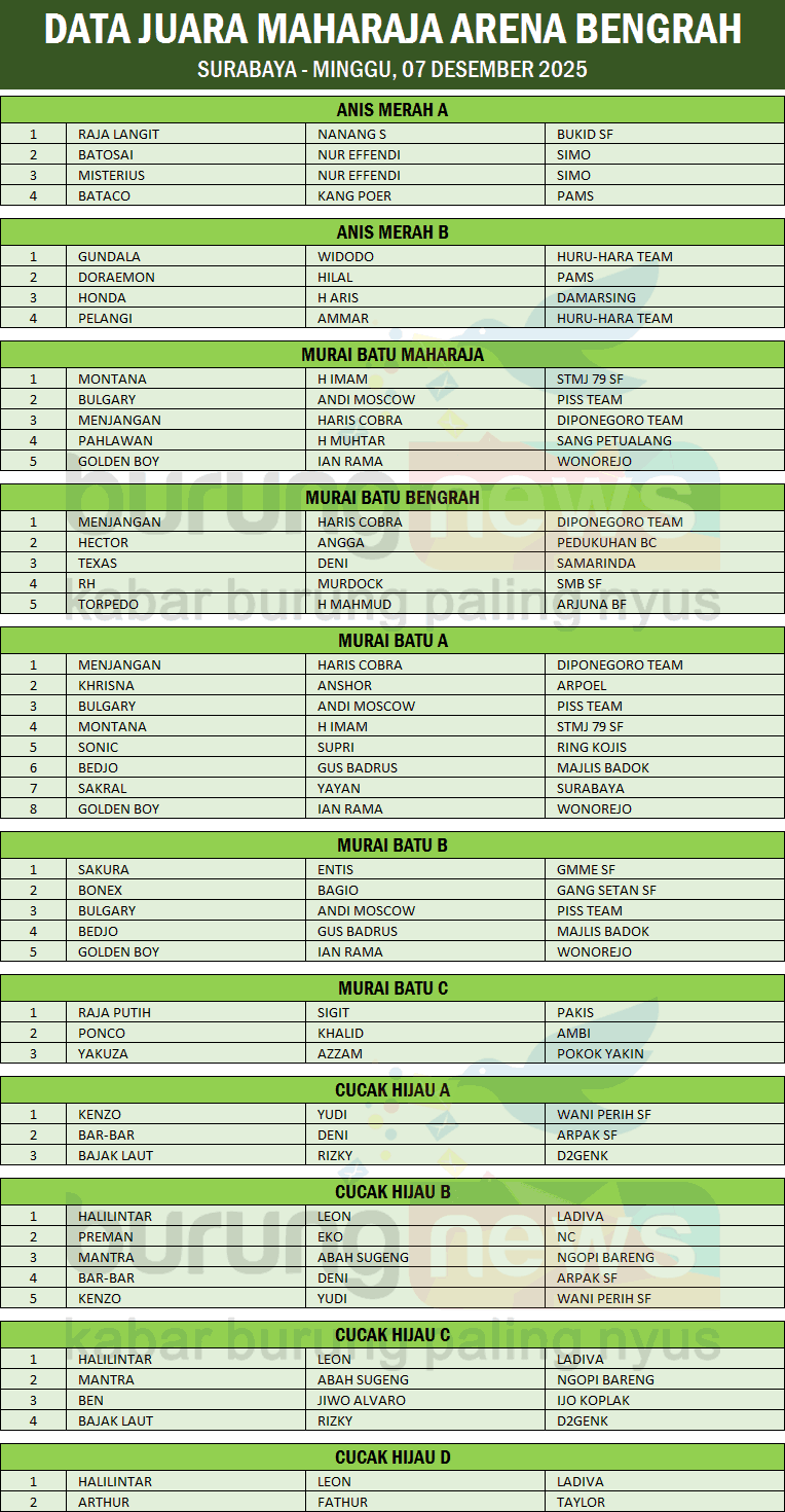 Bermain stabil cucak hijau Halilintar milik Leon berhasil meraiah hatrik, pada latpres Uji Prestasi Maharaja Arena Bengrah - Surabaya Minggu, 07 Desember 2025. Sedangkan murai batu Menjangan milik Haris Cobra menyegel dua kemenangan.