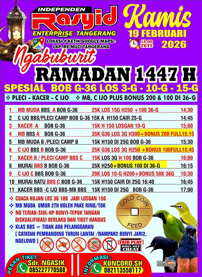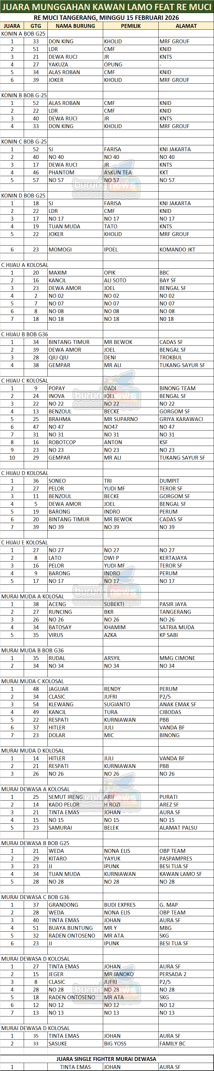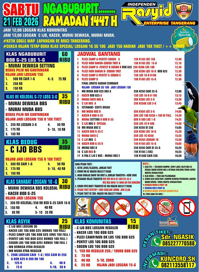 Berikut data juara, foto kegiatan dan agenda berikutnya di gantangan burung berkicau Independen RE MUCI Tangerang. Pastikan kembali hadir ke Re Muci pada gelaran Ngabuburit Ramadhan 19 Februari, Sabtu Ngabuburi pada 21 Februari mulai jam 12.00 dan Losgan Ngabuburit Minggu 22 Februari jam 12.00. Brosur tersedia di bagian bawah berita ini. [maltimbus, terimakasih kuncoro re muci]