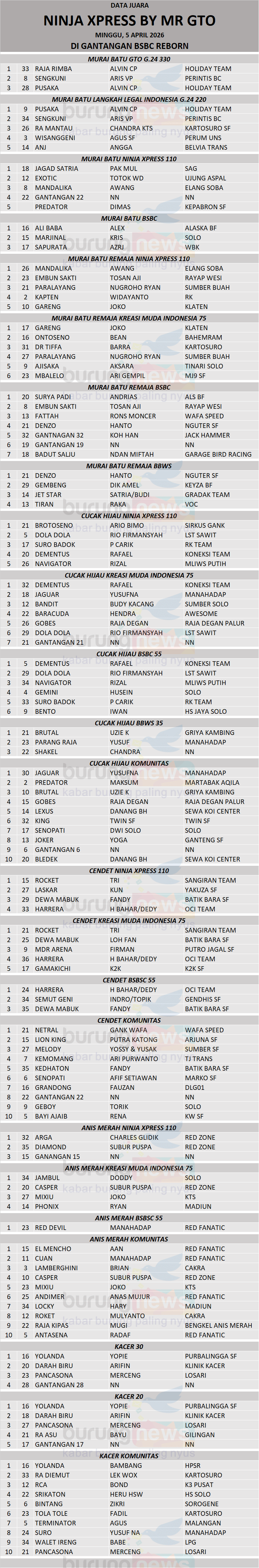 Lomba burung berkicau Ninja Xpress by Mr GTO yang diadakan pada hari Minggu, 5 April 2026 di Gantangan BSBC Reborn, Kampung Sewu, Solo berlangsung ramai dan meriah. Event yang diprakarsai oleh Mr GTO ini diikuti oleh pemain Solo, Sukoharjo, Karanganyar, Wonogiri, Jogja, Klaten, Boyolali, Sragen, dan lain-lain.