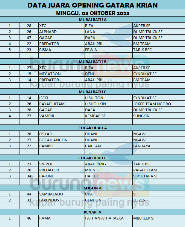 XTC menjadi satu-satunya burung yang mampu menyabet hasil nyeri juara pertama pada Opening Gantangan GATARA (Gantangan Taman Hiburan Krian Indah) hari Minggu, 05 Oktober 2025.