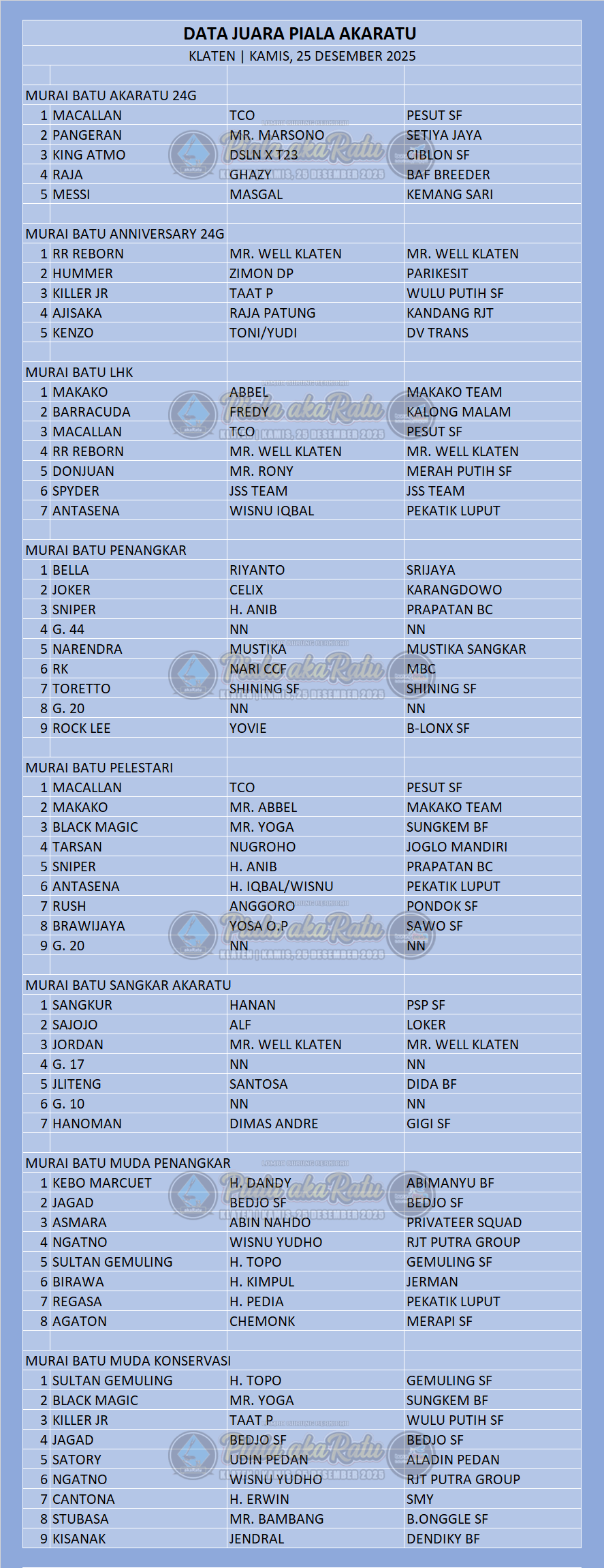 Diikuti 827 kontestan, Piala Akaratu yang digelar pada Kamis, 25 Desember 2025 di Akaratu Stadium, Taman Hutan Kota Gergunung, Klaten berlangsung sukses. Borong juara, murai batu Macallan, cucak hijau Sambo, cendet Smara Gusti, dan kenari Jimat raih predikat burung terbaik.