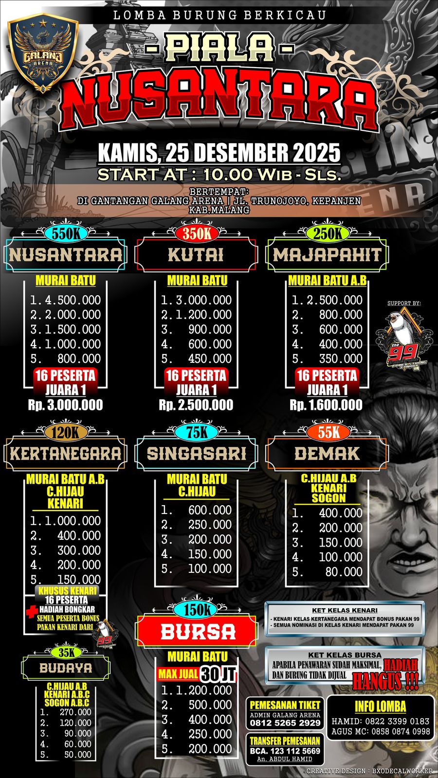 Latber Kamis Galang Arena (18/12/2025) di Jl. Trunojoyo, Kepanjen Malang tambah seru, banyak gaco yang bisa meraih double winner, baik di kelas murai batu, cucak hijau maupun kenari.