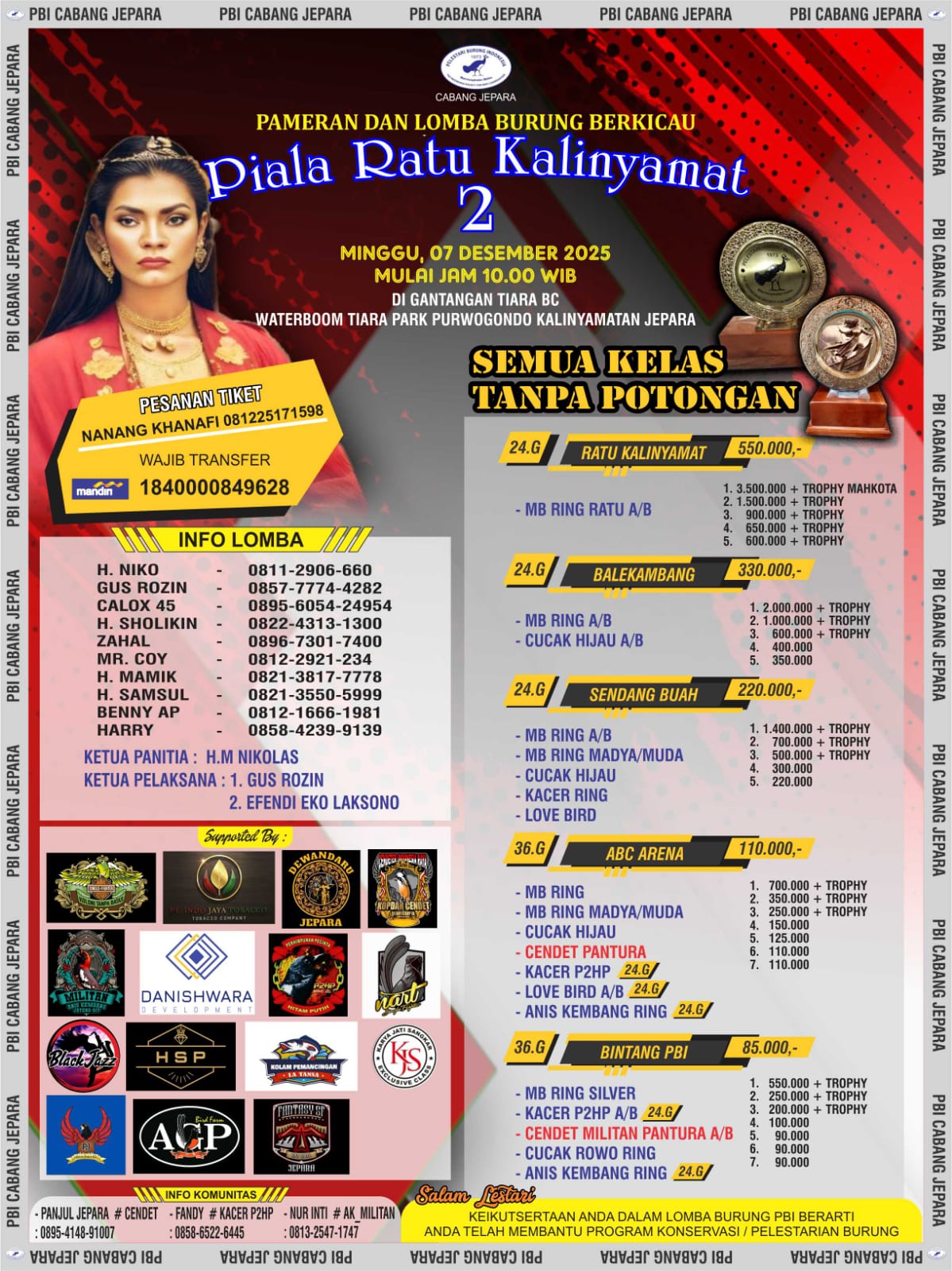 PIALA RATU KALINYAMAT 2 WATERBOOM TIARA PARK Minggu, 07 Desember 2025 Jam 10:00 Diliput oleh burungnews.com DOWNLOAD BROSUR