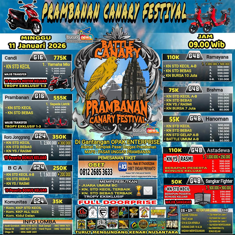 Minggu 11 Januari, H. Yudha siap membawa Jimat meramaikan event prestis Battle Canary bertajuk Prambanan Canary Festival di Gantangan Opak Enterprice. Event ini membuka 16-G, 24-G, hingga kolosal 48-G, dengan bandrol tiket hingga 775K. Tak kalah menantang, event rutin Jogja Istimewa ke-22 pada 15 Februari. [maltimbus]