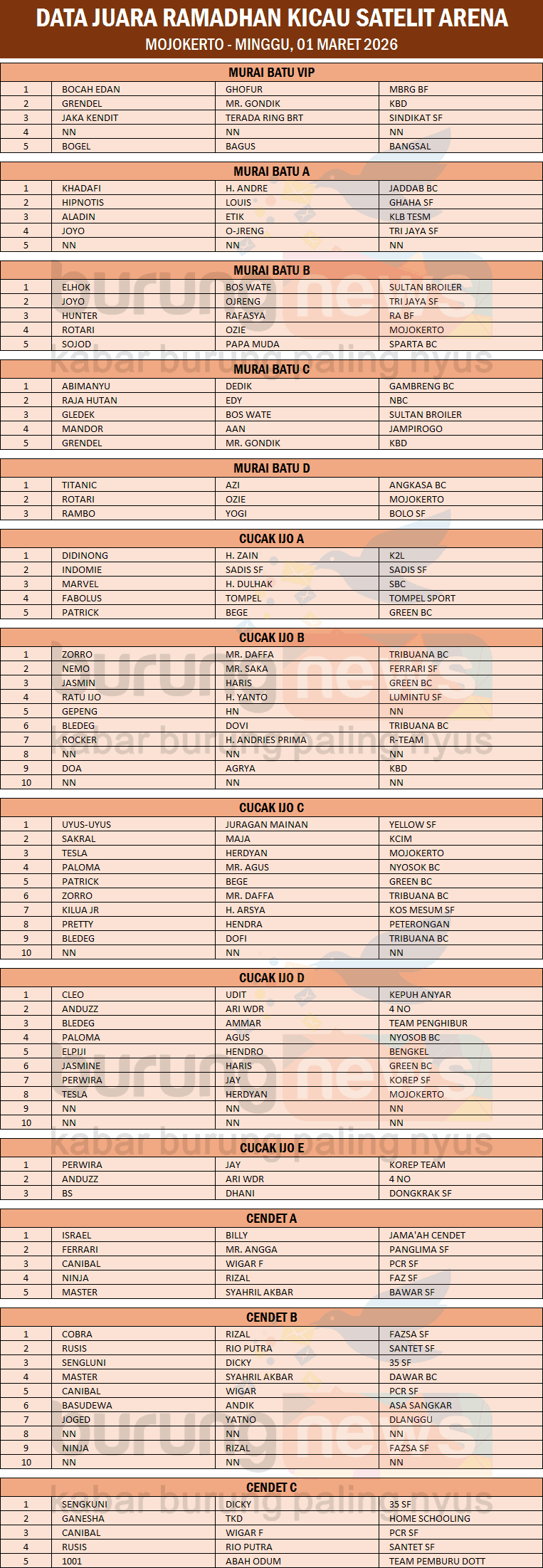 Ramadhan Kicau yang diadakan di Satelit BC Mojokerto berjalan sukses dan lancar. Lomba pada Minggu, 1 Maret 2026 ini bahkan banyak yang full di setiap kelasnya.