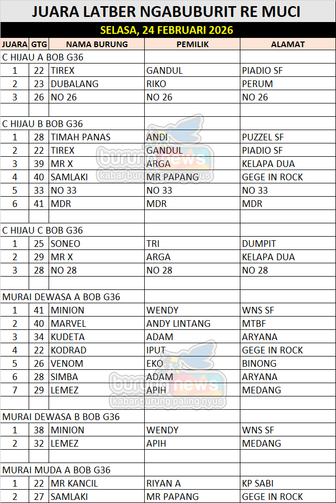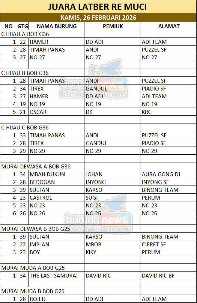 Antusias peserta dari Jabodetabek silih berganti mengisi jadwal gantang, dengan pilihan hari serta variasi kelas yang menjadikan kicau mania punya cukup pilihan dalam mengasah jagoannya. Kini di berbagai daerah memang ada banyak gantangan megah dengan tiket yang cukup tinggi dan menawarkan hadiah menarik, namun sebelumnya tentu perlu diuji lebih dahulu di gantangan rutin seperti Re Muci.