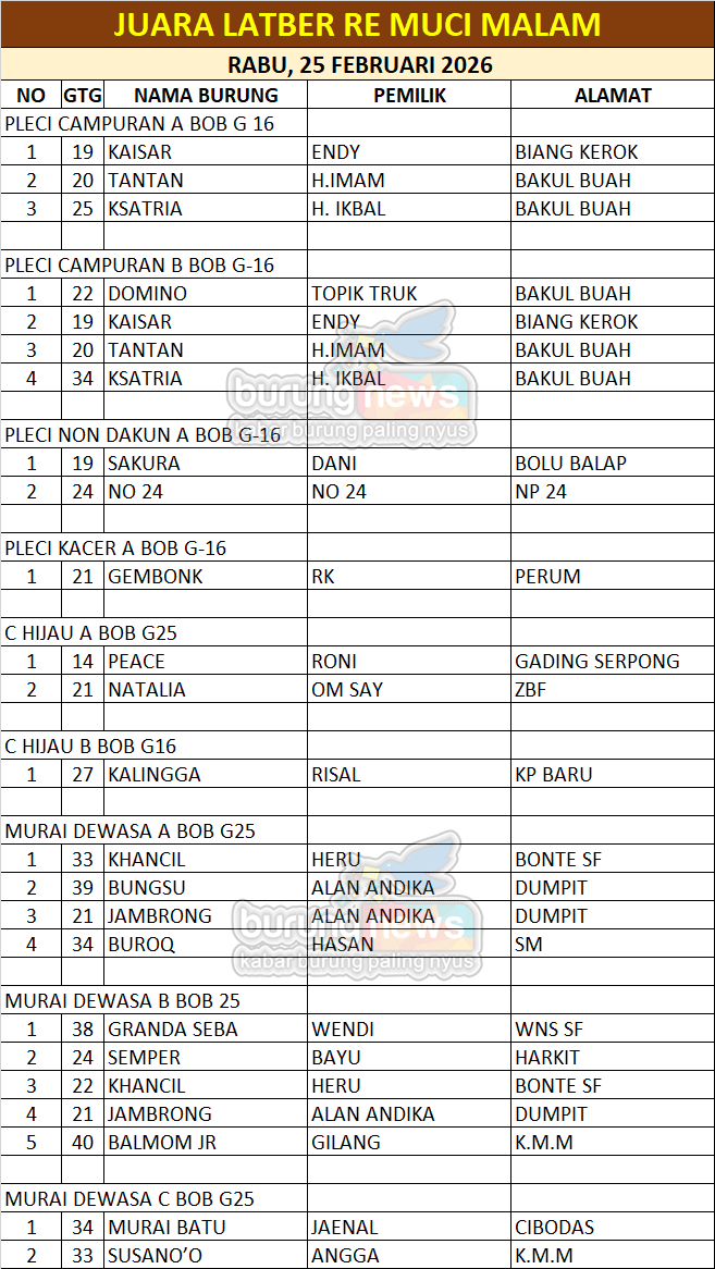 Jenis burung yang dipertandingkan pun beragam. Konsisten membuka kelas komunitas seperti Pleci, Sogon, Tledekan, Cipau, Pentet, Anis Merah, Anis Kembang, Konin, Murai Batu Muda, Kacer, Cucak Hijau, dan Murai Batu dewasa.