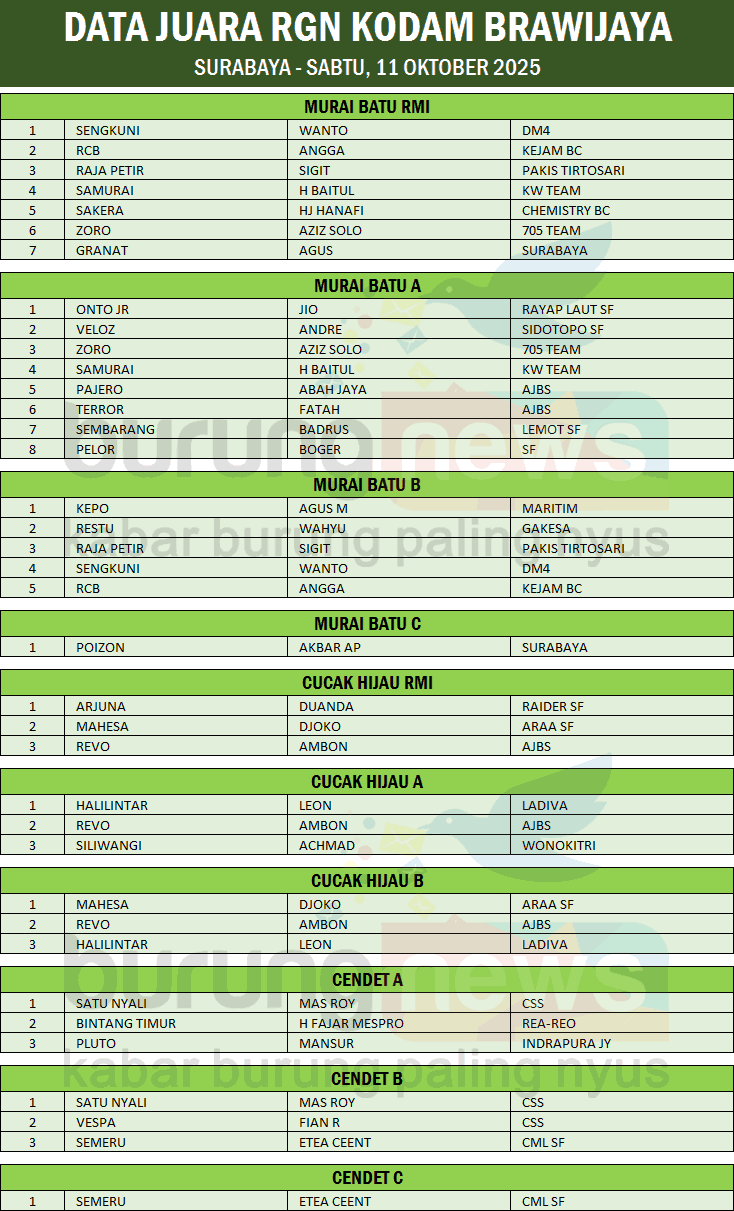 Tampil konsisten pada dua sesi yang dimainkannya, cendet Satu Nyali milik Mas Roy berhasil memborong dua gelar kejuaraan pada latber rutin RGN Kodam Brawijaya - Surabaya hari Sabtu, 11 Oktober 2025.