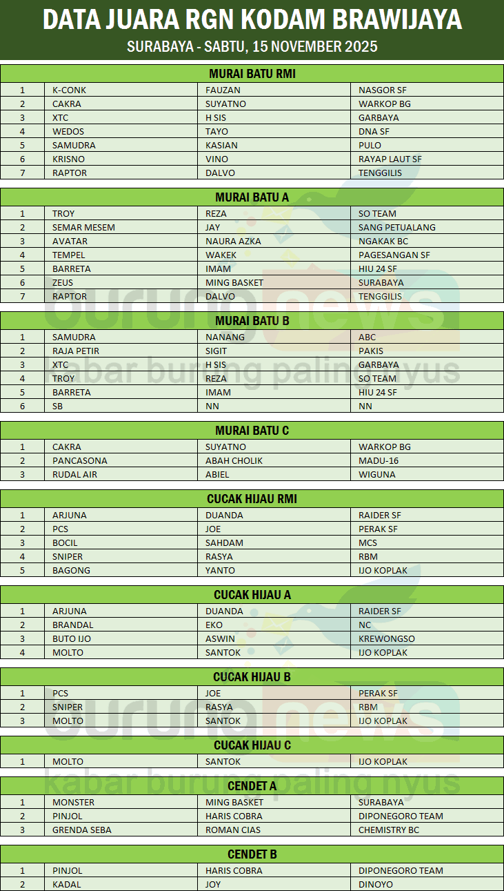 Cucak hijau Arjuna milik Duanda, menjadi satu-satunya jawara yang mampu meraih dua kemenangan pada latber rutin RGN Kodam Brawijaya - Surabaya hari Sabtu, 15 November 2025. Sedangkan cendet Monster milik Ming Basket, tiga minggu selalu koncer terus.