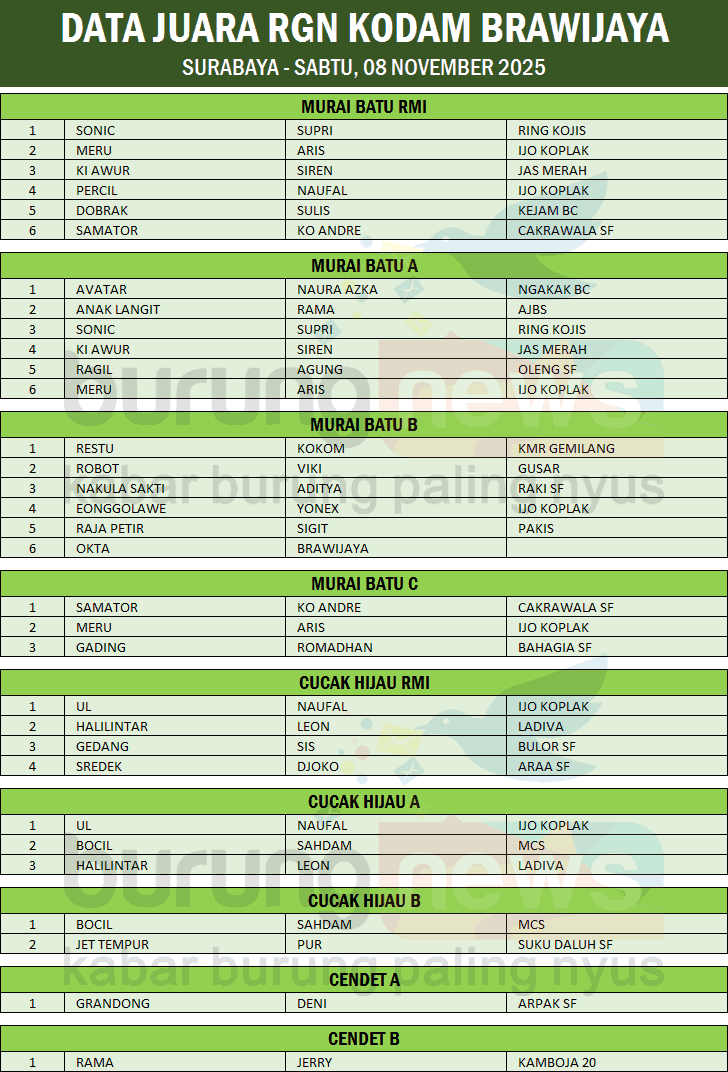 Cucak hijau UL milik Naufal berhasil menggondol dua kemenangan pada latber rutin RGN Kodam Brawijaya - Surabaya hari Sabtu, 08 November 2025. Sedangkan murai batu Sonic milik Supri, menyegel juara kelas utama plus juara ketiga.