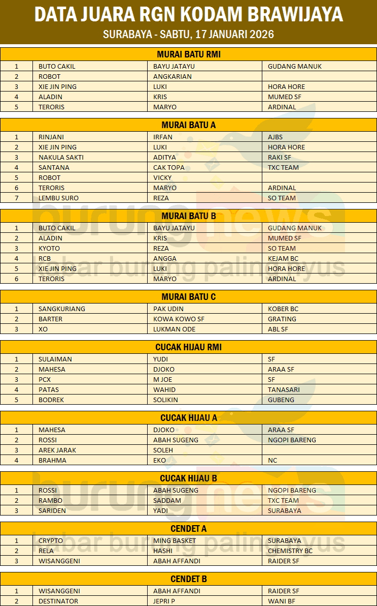 Tampil stabil pada dua sesi, murai batu Buto Cakil milik Bayu Jatayu mampu meraih dua kemenangan pada latber rutin RGN Kodam Brawijaya - Surabaya hari Sabtu, 17 Januari 2026. Sedangkan cucak hijau Mahesa nyaris menggondol dua kemenangan.
