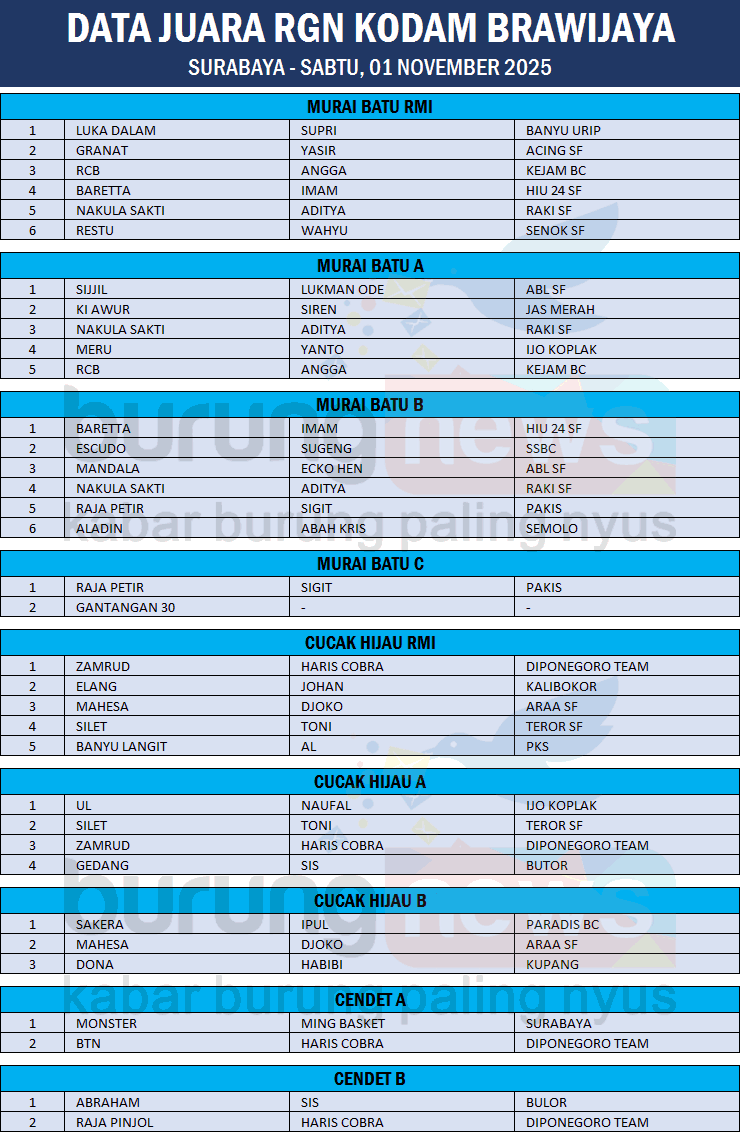 Murai batu Luka Dalam milik Supri dan cucak hijau Zamrud milik Haris Cobra, berhasil menguasai kelas utama pada latber rutin RGN Kodam Brawijaya - Surabaya hari Sabtu, 01 November 2025.