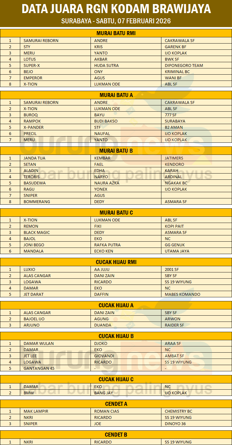 Bermain stabil pada dua sesi awal murai batu Samurai Reborn milik Andre, berhasil meraih dua kemenangan pada latber rutin hari Sabtu (07/02) di gantangan RGN Kodam Brawijaya - Surabaya.