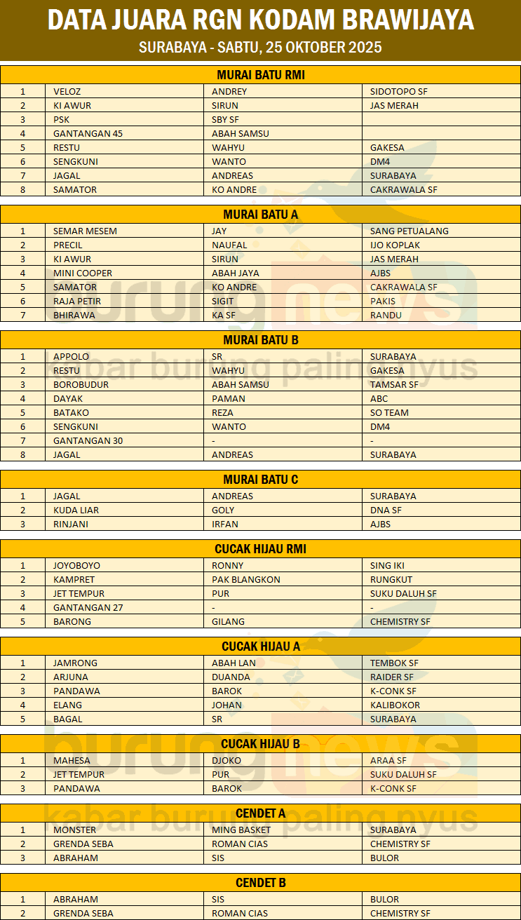 Murai batu Veloz milik Andrey dan cucak hijau Joyoboyo milik Ronny, keduanya berhasil menggondol juara di kelas utama pada latber rutin RGN Kodam Brawijaya - Surabaya hari Sabtu, 25 Oktober 2025.