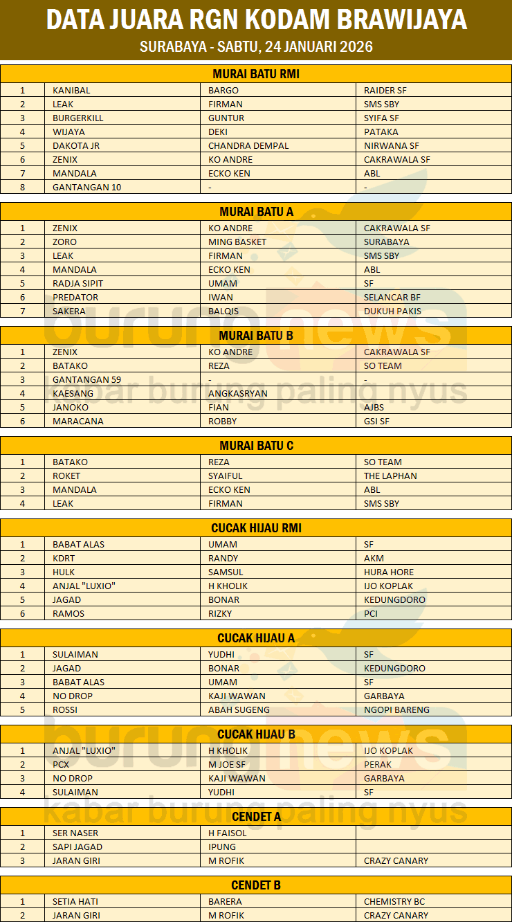 Murai batu Zenix milik Ko Andre, mampu meraih dua kemenangan pada latber rutin RGN Kodam Brawijaya - Surabaya hari Sabtu, 24 Januari 2026. Sedangkan murai batu Kanibal milik Bargo, bisa menduduki podium teratas kelas utama.