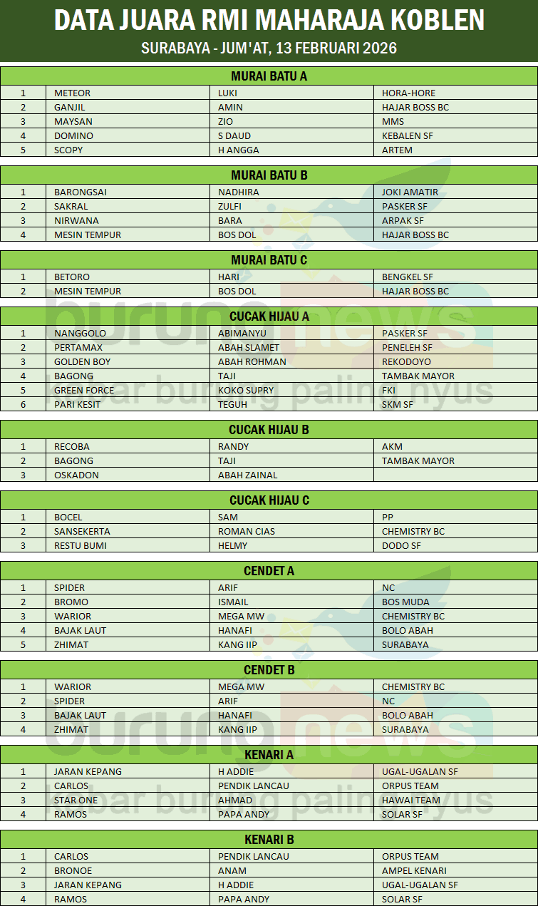 Sama-sama tampil konsisten cendet Spider milik Arif dan kenari Carlos milik PendIk Lancau, nyaris menggondol dua kemenangan pada latber rutin RMI Maharaja Koblen - Surabaya hari Jum'at, 13 Februari 2026.