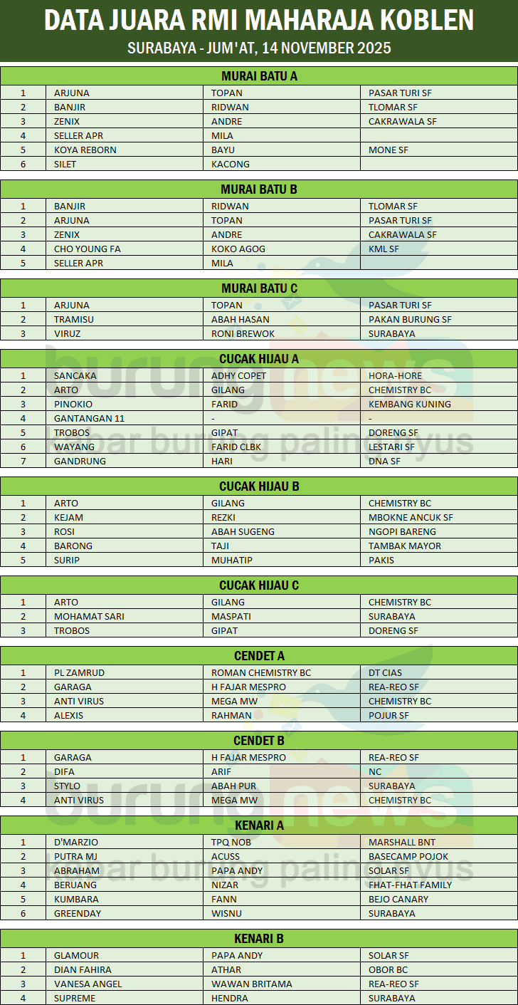 Cucak hijau Arto milik Gilang dan murai batu Arjuna milik Topan, sama-sama tampil bagus hingga nyaris menggondol tiga kemenangan atau hatrik pada latber rutin RMI Maharaja Koblen - Surabaya hari Jum'at, 14 November 2025.