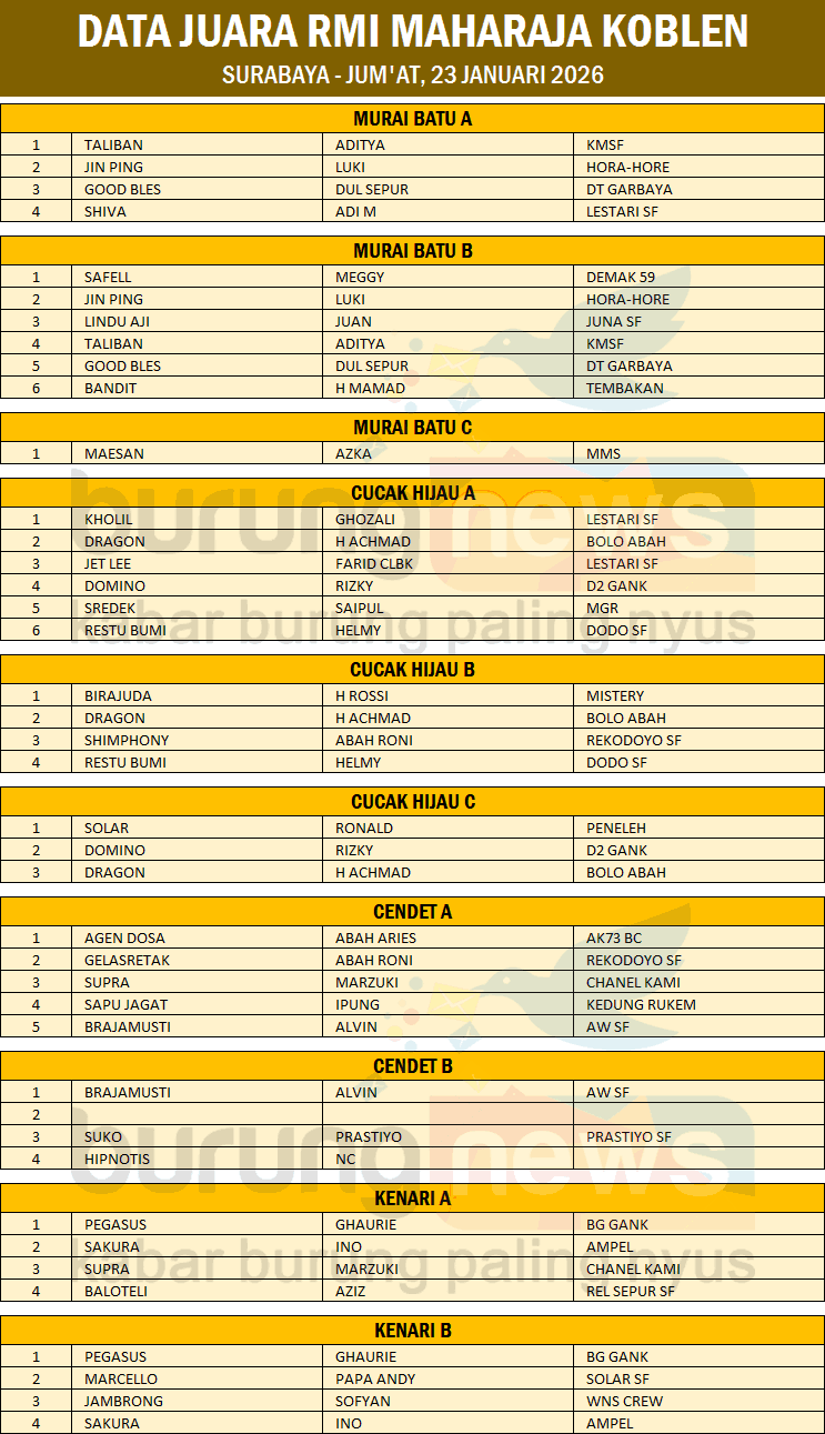 Tampil konsisten pada dua sesi kenari Pegasus milik Ghaurie berhasil memborong semua kemanangan pada latber rutin RMI Maharaja Koblen - Surabaya hari Jum'at, 23 Januari 2026.