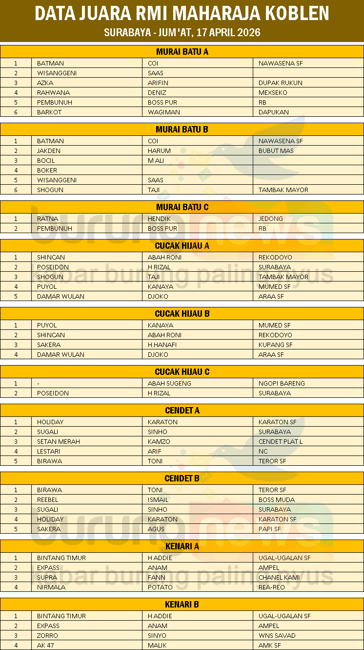Murai batu Batman milik Coi dan kenari Bintang Timur milik H Addie, keduanya bisa meraih dua kemenangan pada latber rutin hari Jum'at di gantangan RMI Maharaja Koblen - Surabaya.