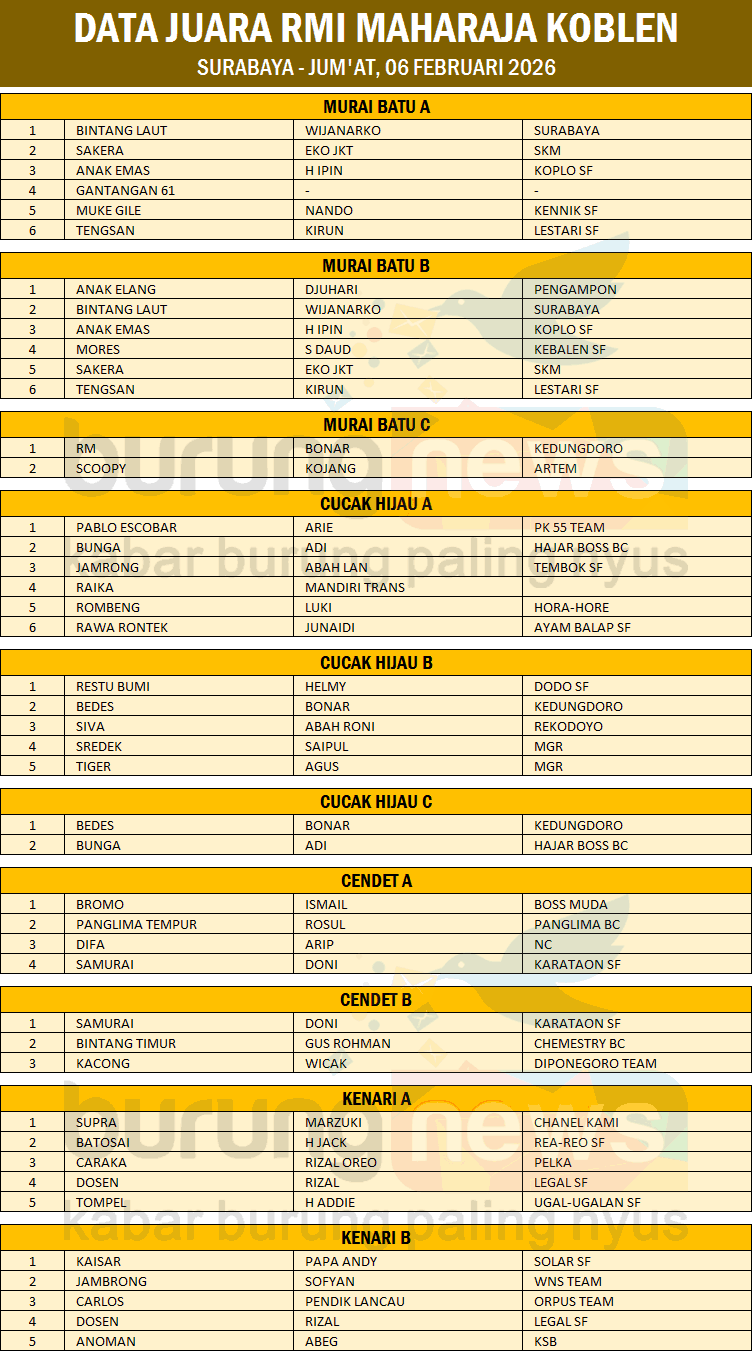 Dua jawara murai batu Bintang Laut milik Wijanarko dan cucak hijau Bedes milik Bonar, nyaris menggondol dua kemenangan pada latber rutin RMI Maharaja Koblen, Surabaya Jum'at, 06 Februari 2026.