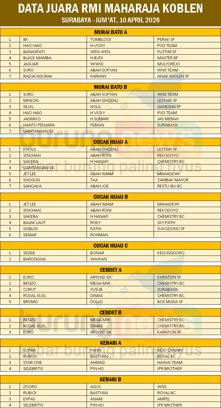 Murai batu BK milik Tomblock dan cucak hijau Kholil milik Abah Ghozali, menjadi juara di kelas utama pada latber rutin hari Jum'at (10/04) di gantangan Maharaja Koblen - Surabaya.