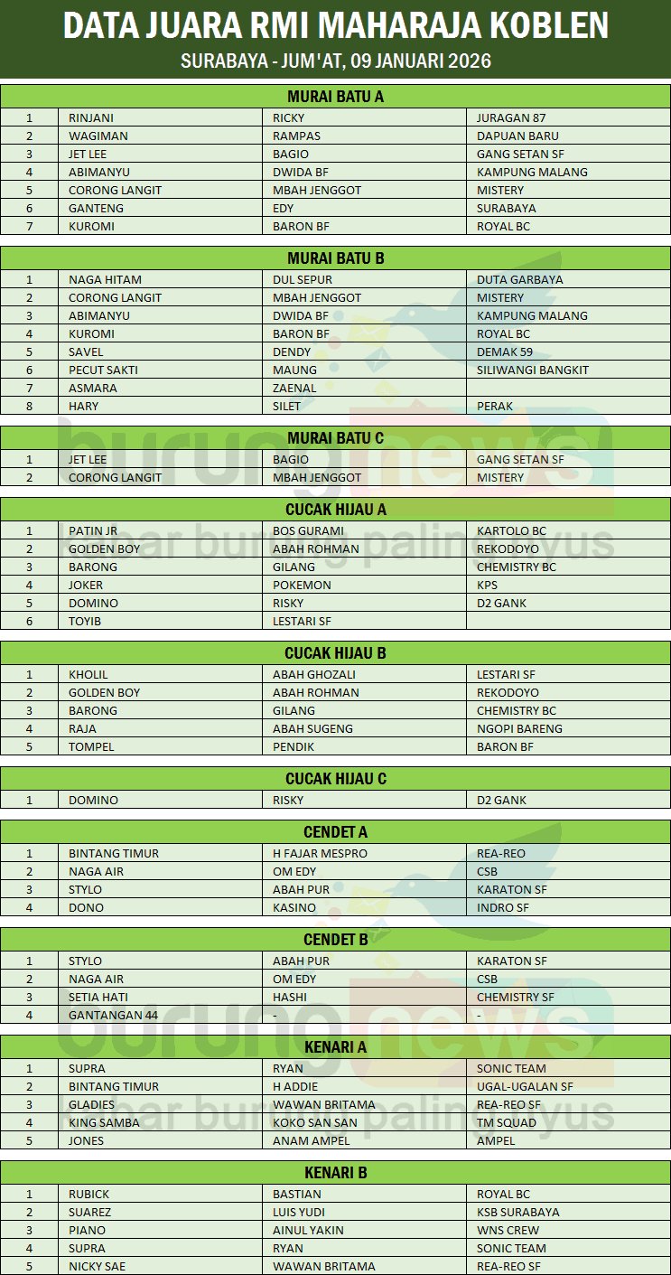 Murai batu Rinjani milik Ricky dan cucak hijau Patin Jr, berhasil meraih kemenangan di kelas utama latber rutin RMI Maharaja Koblen - Surabaya hari Jum'at, 09 Januari 2026.