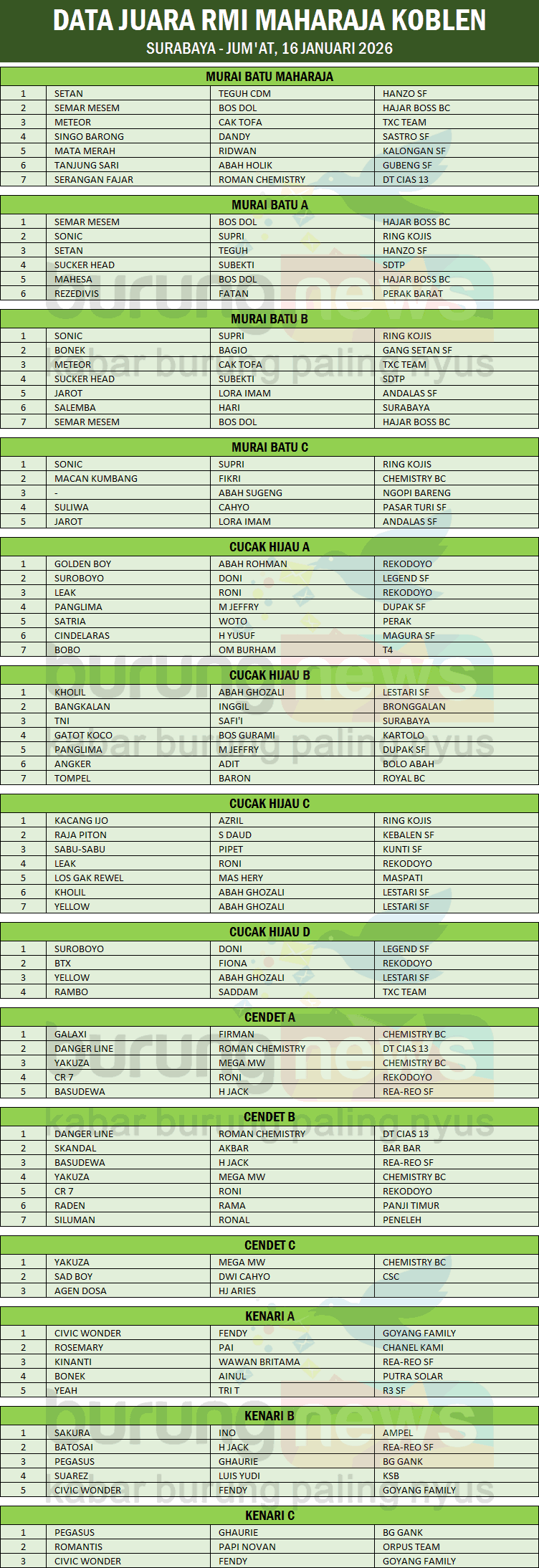 Murai batu Setan milik Teguh CDM berhasil menguasai juara kelas utama pada lomba spesial Isra Miraj di gantangan RMI Maharaja Koblen - Surabaya Jum'at, 16 Januari 2026. Sedangkan murai batu Sonic milik Supri hampir merah hatrik.