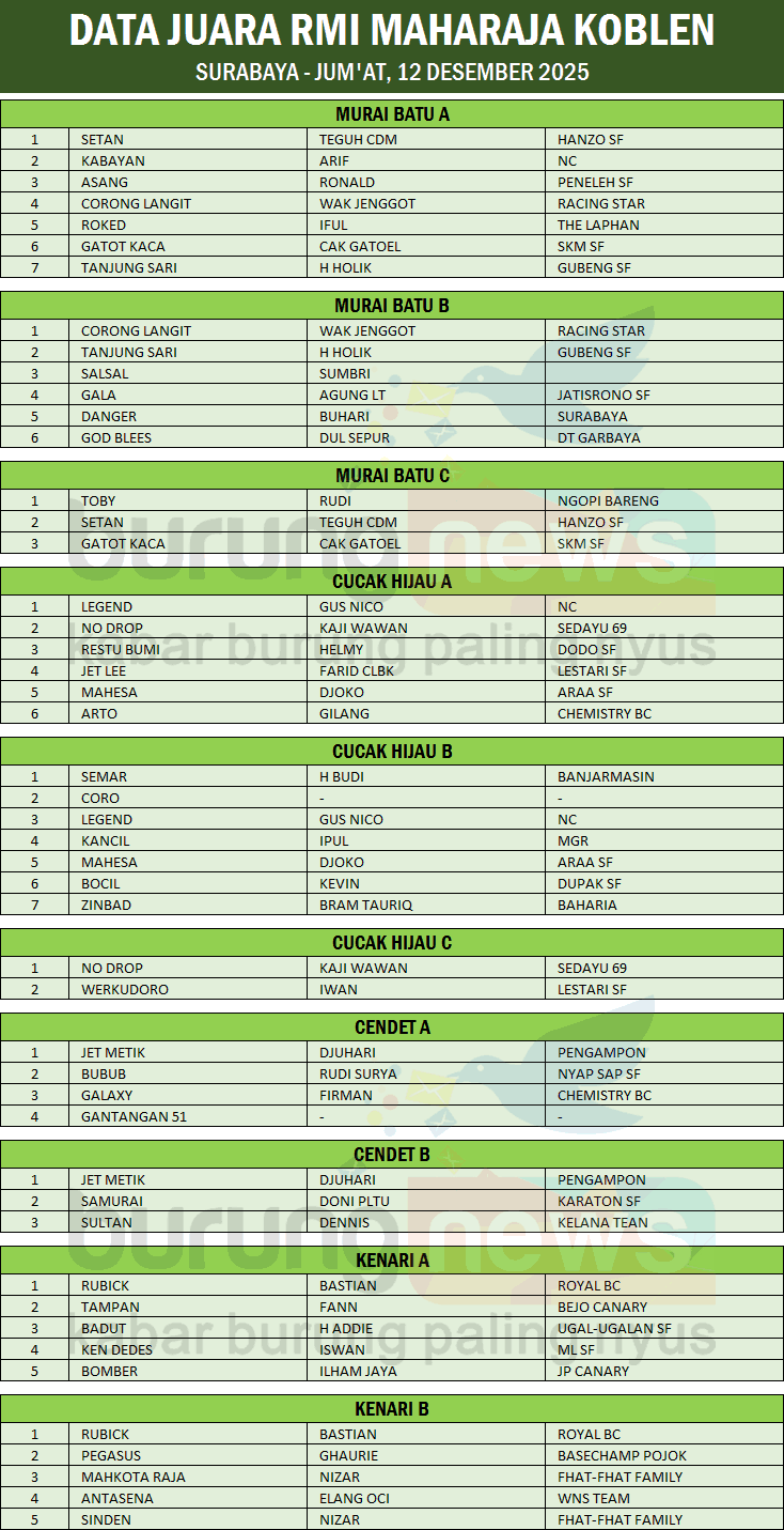 Pada gelaran latber rutin hari Jum'at (12/12) ada transaksi murai batu Luxor milik Imam dibeli oleh Teguh CDM, sedangkan cendet Jet Metik milik Djuhari dan kenari Rubick milik Bastian bisa meraih dua kemenangan di gantangan Maharaja Koblen - Surabaya.
