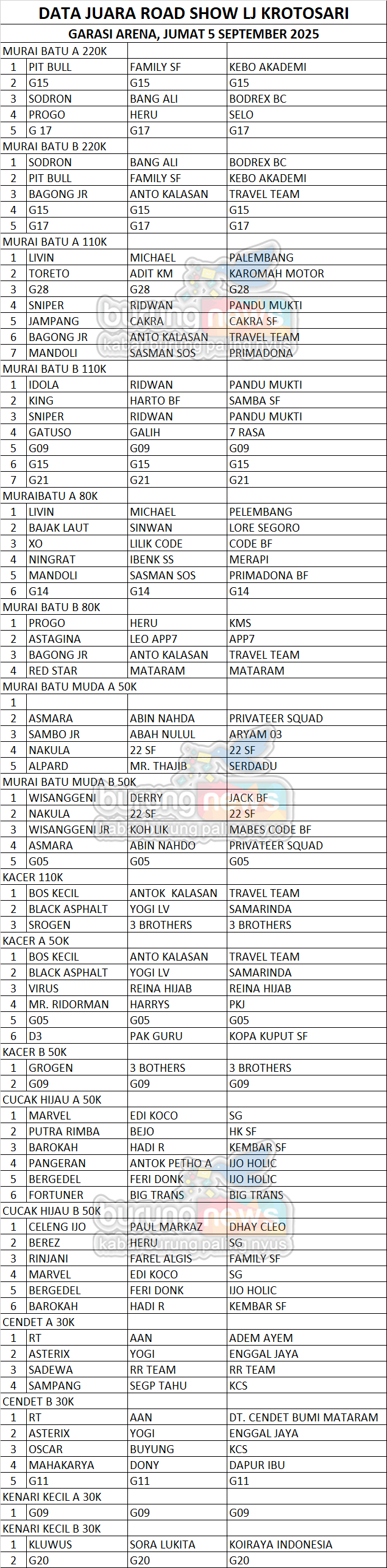 ROAD SHOW LJ KROTOSARI GARASI ARENA + DATA JUARA