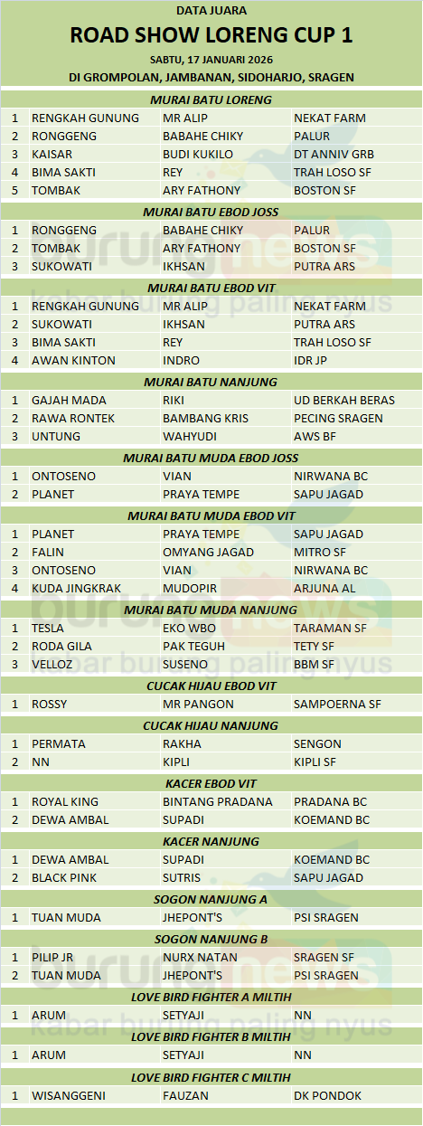 Road Show Loreng Cup 1 JKM Sragen yang diadakan pada hari Sabtu, 17 Januari 2026 berlangsung lancar dan kondusif. Gelaran yang diinisiasi oleh Yoman Loreng dan kawan-kawan JKM (Jambanan Kicau Mania) ini selain didominasi pemain lokal juga diikuti oleh pemain Solo, Sukoharjo, Klaten dan Boyolali.
