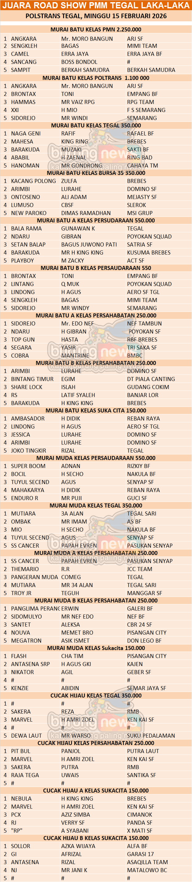 Siapa saja para juara di Road Show PMM Tegal Laka-Laka, bisa disimak di bawah ini. Cek juga brosur dan stoppres berikutnya yang menarik untuk diikuti kembali. [maltimbus, terimakasih alek dan somat]