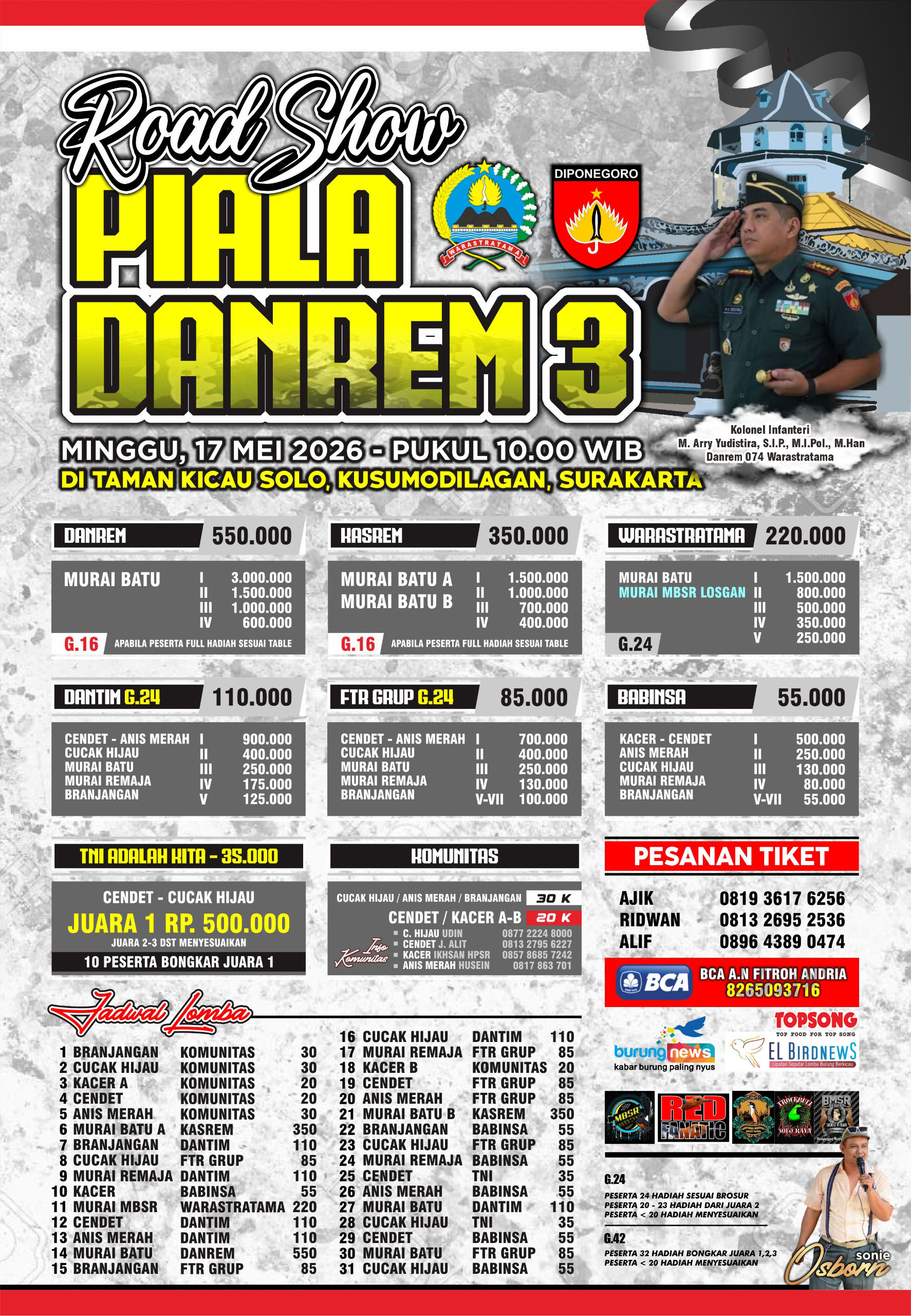 Kedatangannya, untuk meramaikan gelaran Road to Piala Danrem 3. Event Road to ini, digelar secara marathon lintas daerah di Solo Raya. “Kali ini giliran Boyolali, kami memilih di gantangan Larasati Cepogo. Berikutnya kita menuju gantangan TKS Kusumodilagan Solo pada 17 Mei dengan brosur bisa dilihat di bagian bawah berita ini, lalu Klaten waktu akan kami beritahu lebih lanjut,” terang Fitroh selaku EO kepada burungnews.com.