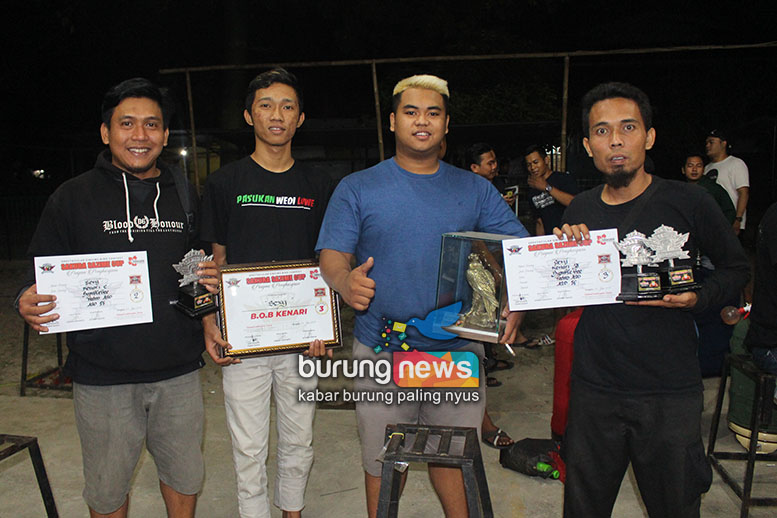Arfann dan Alwi Ahmadi bersama rekan-rekan Mabes SF kurang beruntung untuk membawa pulang hadiah sepeda motor, walaupun juara pertama love bird Sania yang turun di kelas Love Bird Balibu Megatron kurang 3 peserta untuk memenuhi hadiah bongkar. “Hanya 30 peserta yang ikut kelas Balibu Megatron, kurang 3 lagi hadiah motor keluar,”cetus Alwi Ahmadi. Walaupun belum beruntung memabawa pulang sepeda motor, team Mabes SF tetap bersenang-senang dengan kemenangan beberapa jagoannya, selain Sania ada pula Sabdo Palon dan cucak hijau Seruni dan Ucil yang bisa membawa pulang tropi juara.