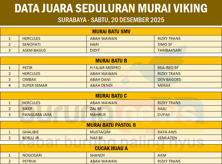 Bermain stabil pada tiga sesi yang diperlombakan, murai batu Hercules milik Abah Wawan dari Rizky Trans nyaris menggondol tiga kemenangan pada latber rutin Seduluran Murai Viking di gantangan Maharaja Arena, Bengrah Surabaya Sabtu, 20 Desember 2025.