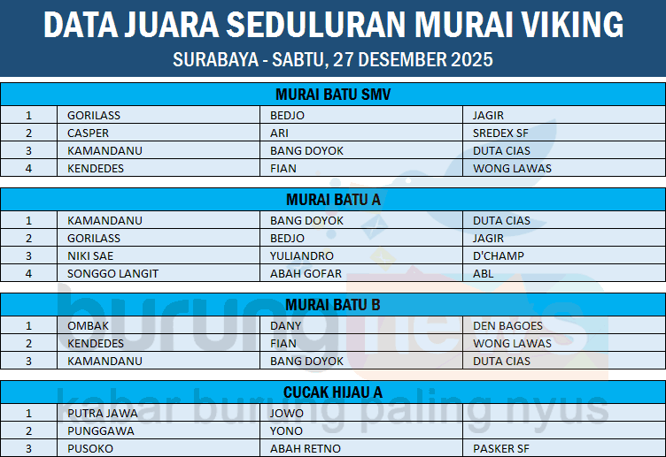 Murai batu Kamandanu milik Bang Doyok, berhasil menjadi burung terbaik pada gelaran latber rutin Seduluran Murai Viking (SMV) di gantangan Maharaja Arena Bengrah - Surabaya hari Sabtu, 27 Desember 2025.