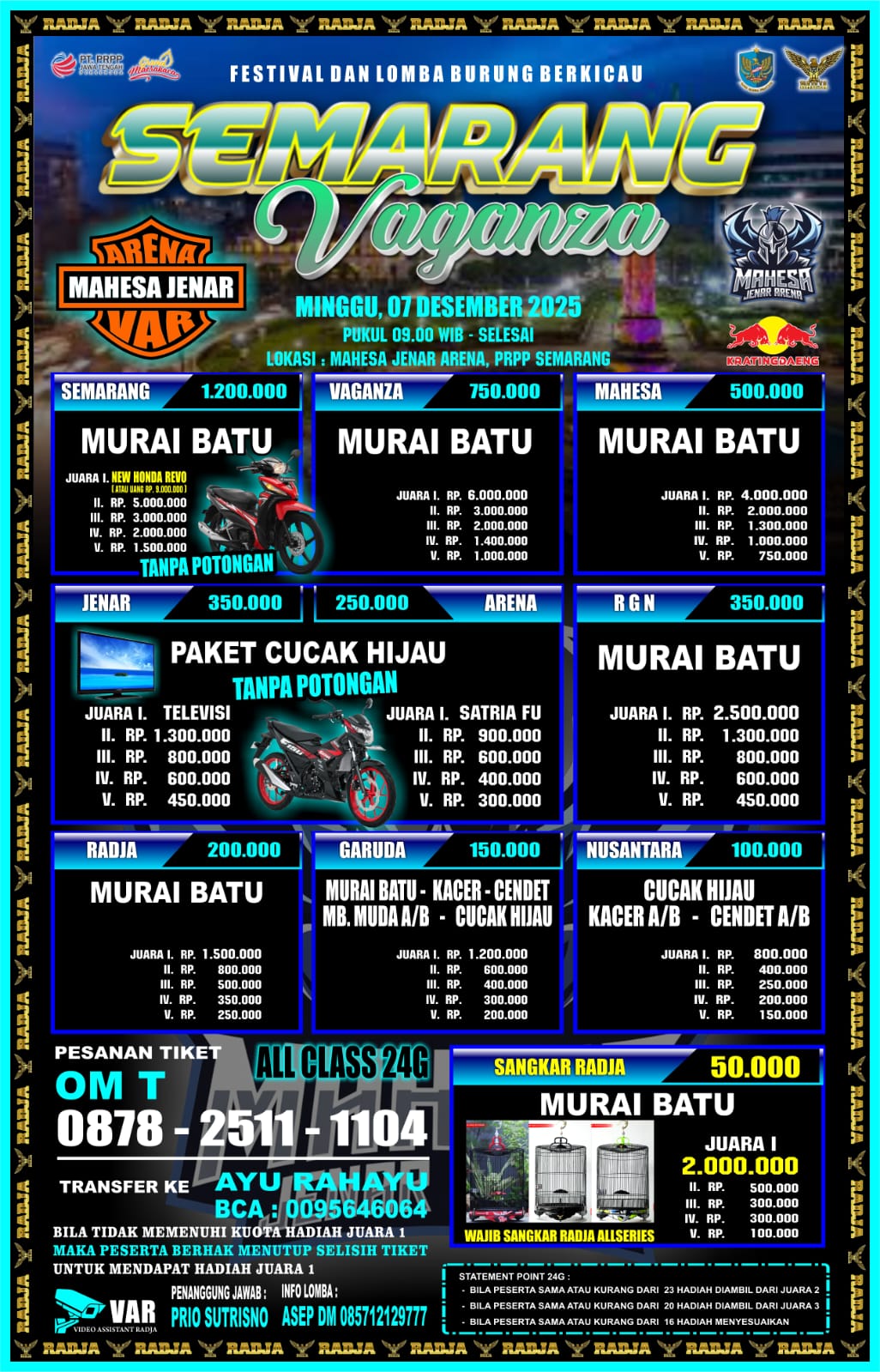 Tembus 1349 peserta, lomba burung berkicau Semarang Vaganza berjalan sukses. Meski diguyur hujan dari awal sampai akhir lomba, peserta tetap fight untuk mengadu amunisi-amunisi terbaiknya. Siapa sajakah pemenangnya?