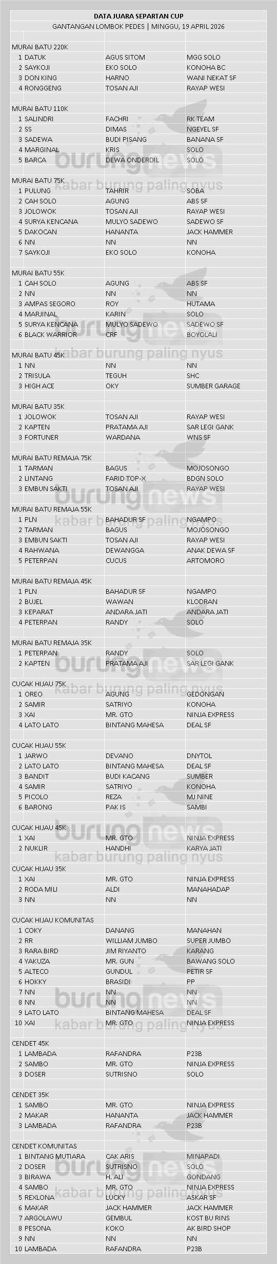 Gantangan Lombok Pedes diserbu oleh kicaumania dari berbagai daerah pada Minggu, 19 April 2026 guna mengikuti lomba burung berkicau Separtan Cup. Lomba yang diprakarsai oleh Agus Winner dan Mas Kik ini diramaikan oleh komunitas cucak hijau dan cendet yang dikoordinatori Udin dan Alit.