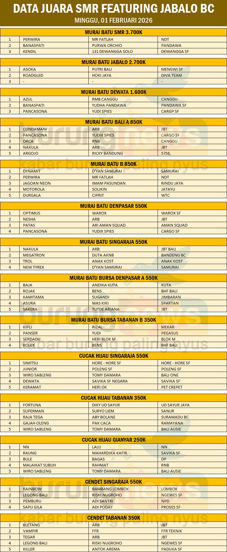 Gelaran perdana SMR Featuring Jabalo BC yang berlangsung pada Minggu, 01 Februari 2026 sukses besar dan meninggalkan kesan positif bagi para kicaumania. Bertempat di Lapangan Korem 163 Wira Satya, Denpasar – Bali, event ini berjalan lancar, tertib, dan penuh gengsi. Sekaligus menjadi debut manis Jabalo BC yang langsung tancap gas bersama sistem juri SMR (Seduluran Murai Reborn).