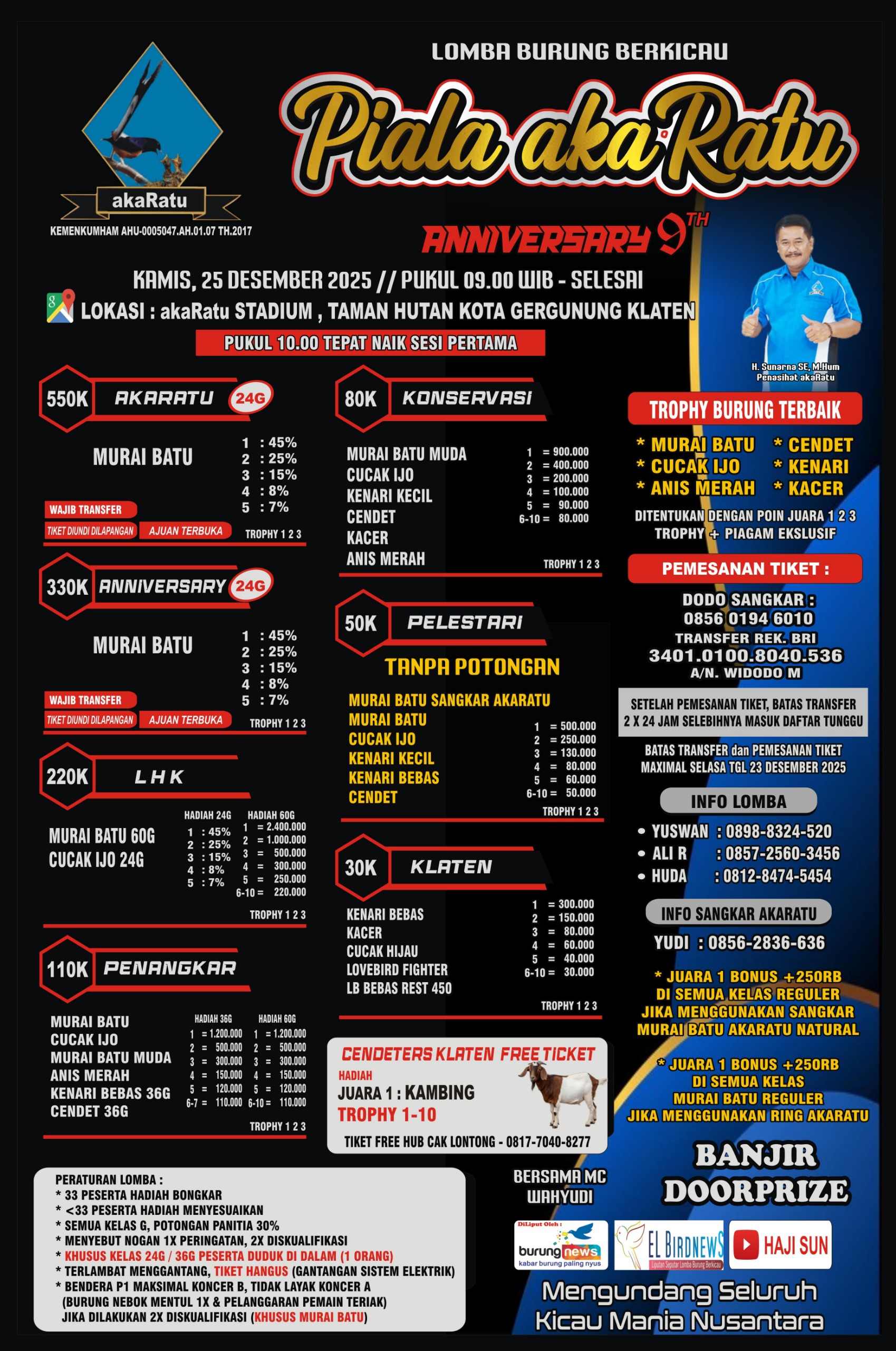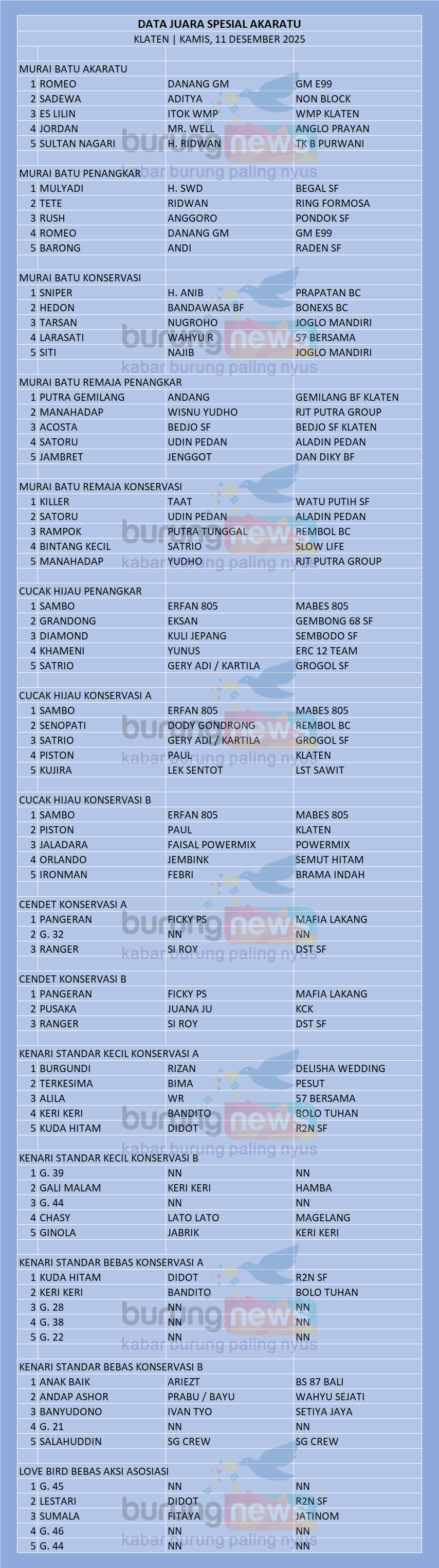 Spesial Akaratu yang digelar pada Kamis, 11 Desember 2025 di Akaratu Stadium, Taman Hutan Kota Gergunung, Klaten berlangsung sukses. Dibatasi hanya 24 gantangan (24G), kelas murai batu, murai batu remaja, cucak hijau, kenari, bahkan love bird terpantau terisi penuh peserta (full gantangan).