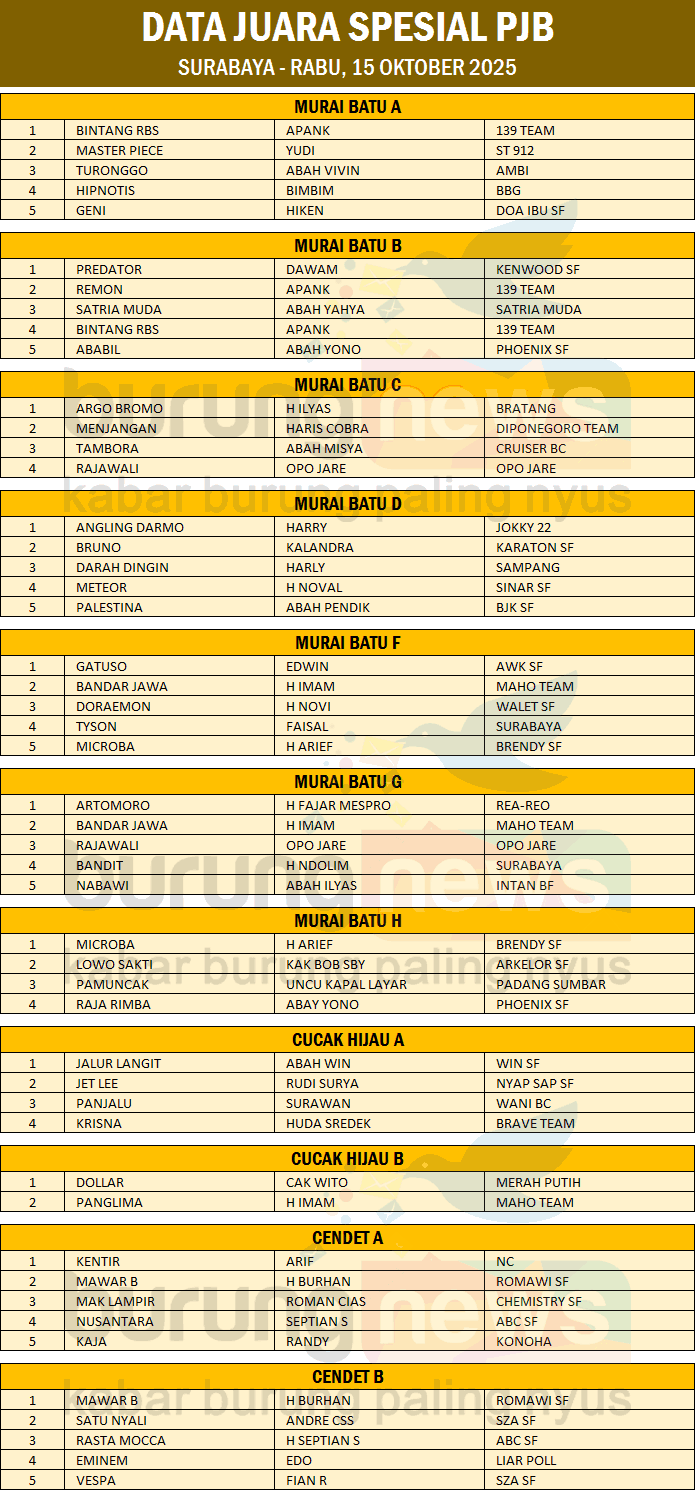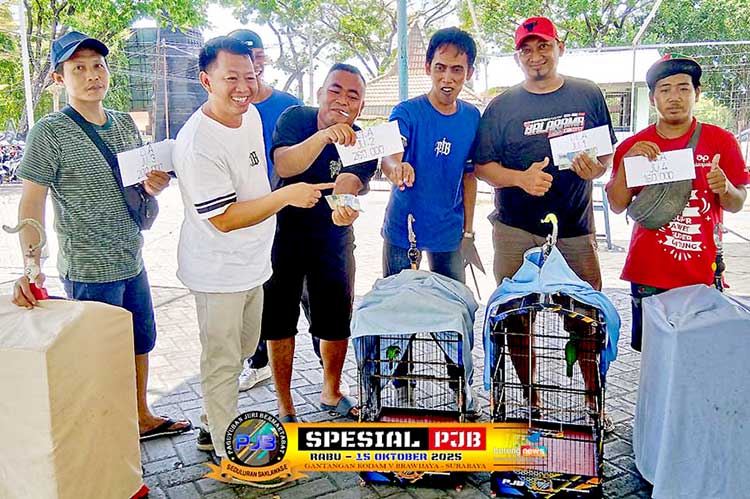 Murai batu Bintang RBS hasil ternakan sendiri milik Apank, berhasil menggondol juara di kelas utama murai batu A pada gelaran spesial PJB di gantangan Kodam V Brawijaya - Surabaya hari Rabu, 15 Oktober 2025.