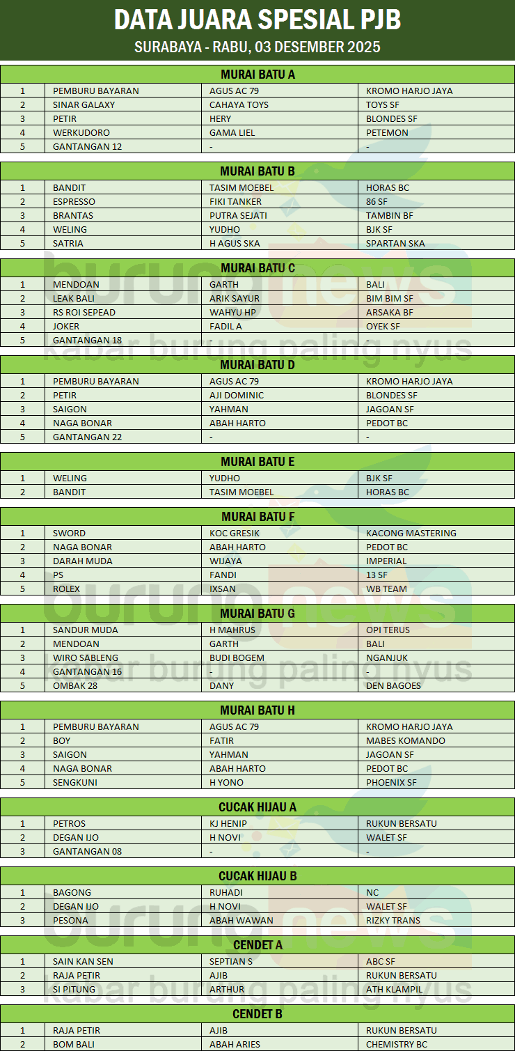 Bermain stabil pada tiga sesi, murai batu Pemburu Bayaran milik Agus AC 79 bisa menggondol tiga kemenangan atau hatrik pada latber PJB kali ini di gantangan Maharaja Arena Bengrah - Surabaya (Rabu, 3/12). Sedangkan cendet Raja Petir milik Ajib, hampir meraih dua kemenangan.
