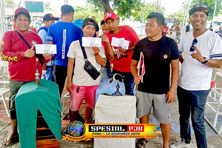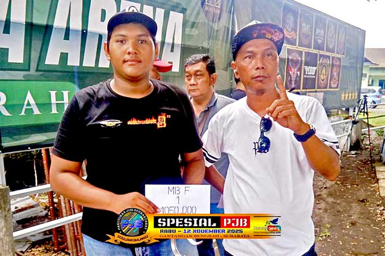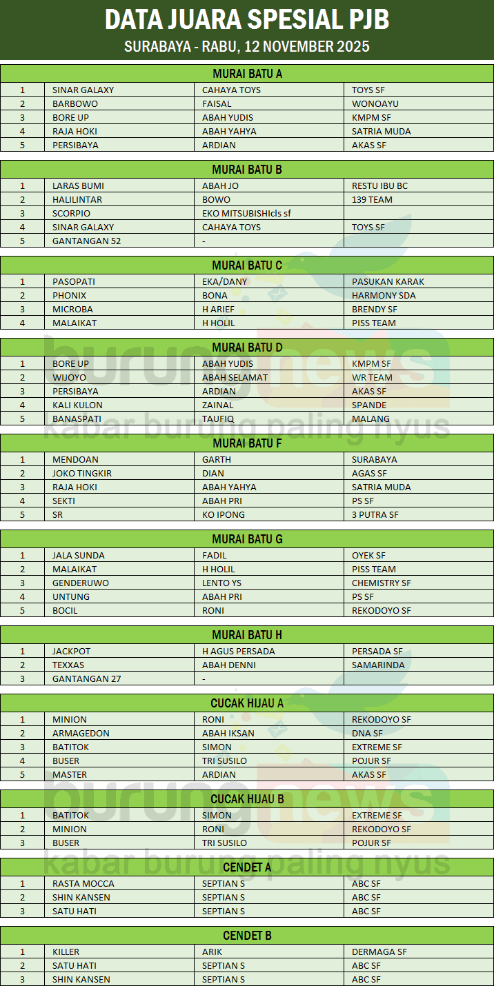 Murai batu Sinar Galaxy milik Cahaya Toys dan cucak hijau Minion milik Roni, berhasil menduduki posisi teratas kelas utama pada latber rutin spesial PJB di gantangan Maharaja Arena Bengrah - Surabaya hari Rabu, 12 November 2025.