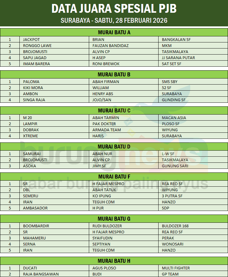 Murai batu SR milik H Fajar Mespro, nyaris menggondol dua kemenangan pada gelaran latber rutin spesial PJB di gantangan Maharaja Arena Bengrah - Surabaya hari Sabtu, 28 Februari 2026. Sedangkan Jackpot milik Brian berhasil meraih juara di kelas utama.
