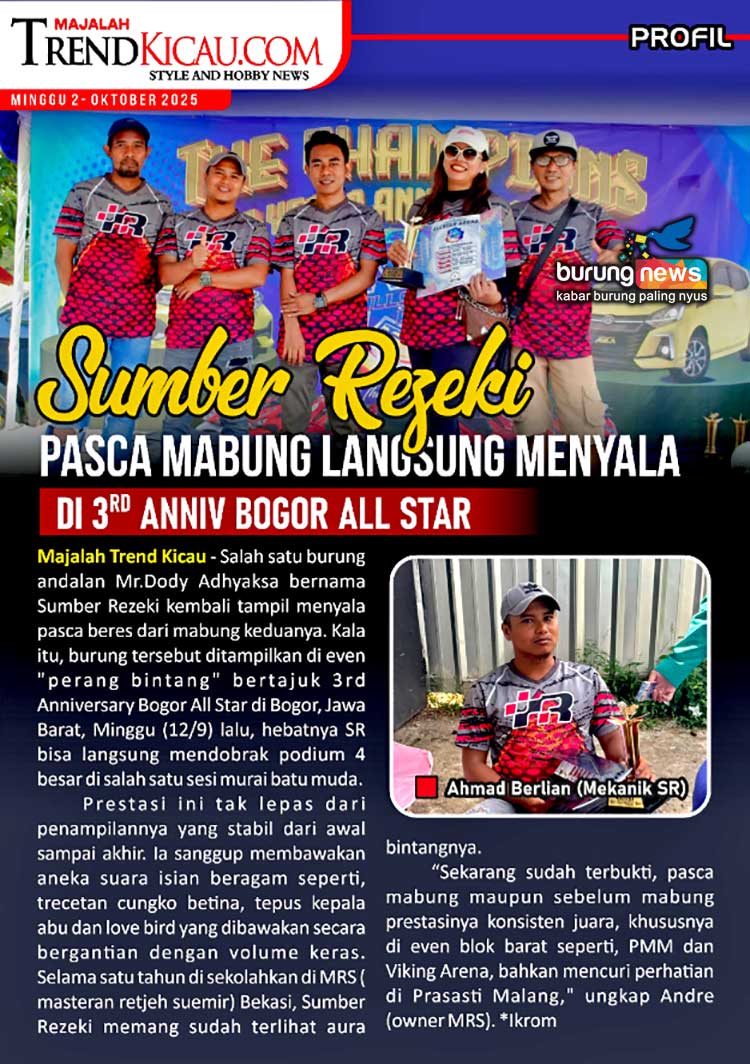 Baru saja selesai mabung, sekitar satu bulan, murai batu Sumber Rejeki milik Mr Doddy Adhyaksa dari Jawa Timur mulai menjadi ancaman. Dua pekan lalu, di event Anniversary Bogor All Star (12/9) masuk di tangga juara 4 besar.