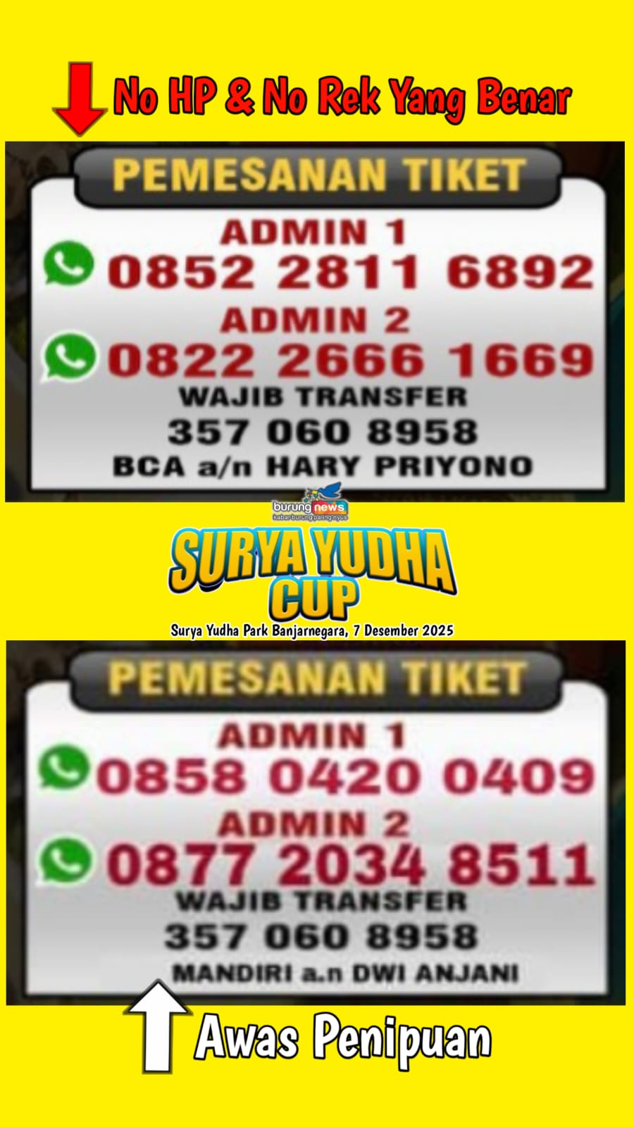 Para penipu dengan modus memalsukan brosur, mengganti nomor telepon admin dan nama bank/atas nama rekening panitia, masih saja bergerilya mencari mangsa. Lazimnya, yang disasar adalah event-event yang prospek ramai. Kali ini, yang dijadikan objek adalah event Surya Yudha Cup Banjarnegara, 7 Desember besok.